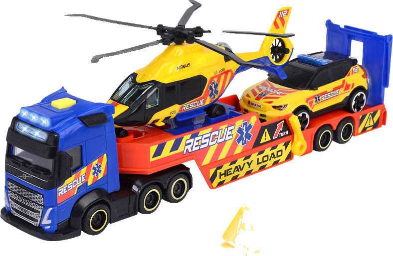 Med den öppningsbara bakdörren kan denna räddningstransporten lasta av räddningsbilen som är parkerad på släpet. Räddningstransporten har också en helikopter på släpet, barnen kan skicka ut dessa fordon på räddningsuppdrag och utspela ett spännande räddningsäventyr!