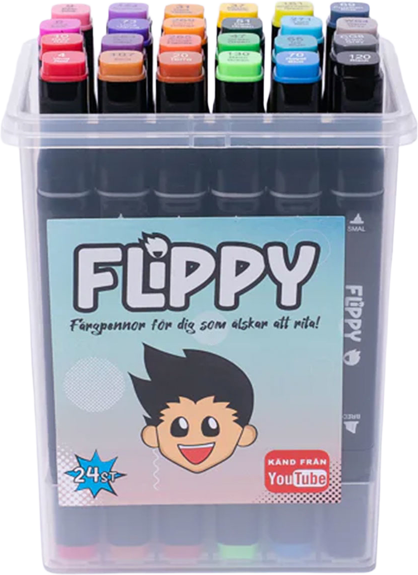 Flippy alkoholbaserade pennor är av hög kvalitet och utformade för den som brinner för att rita och teckna. Varje penna är utrustad med dubbla spetsar: en bred spets för att effektivt täcka större ytor, samt en smal spets för att möjliggöra detaljarbete med precision. Skulle en penna skadas och börja läcka rekommenderas att den omedelbart kasseras, då bläcket kan vara svårt att avlägsna från kläder och föremål. För att undvika att bläcket torkar ut bör pennorna alltid förvaras med korken på när de inte används.