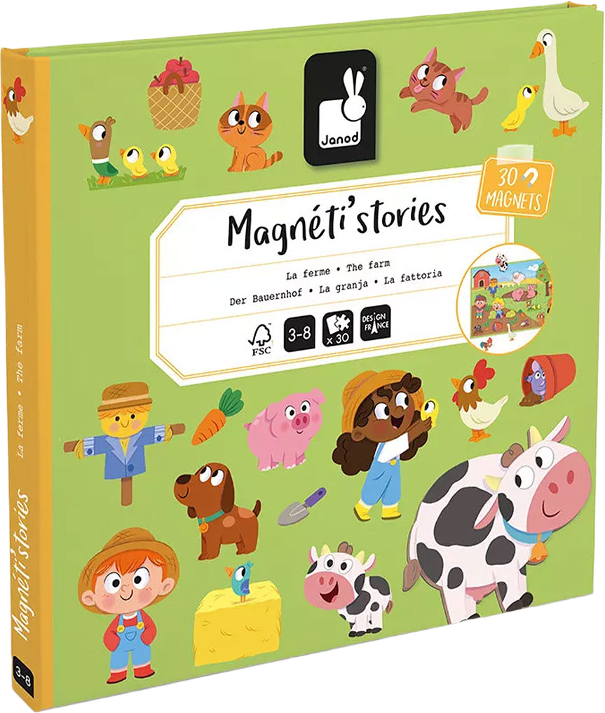 Kuckeliku! Alla små framtida bönder är välkomna! Barn från 3 år och uppåt bjuds in till bondgården med denna illustrerade magnetiska bakgrund som kombinerar skörd med smågrisar. Det magnetiska spelet består av en magnetisk bakgrund och 30 magneter. Barnets finmotorik – en viktig del i tidig utveckling – tränas när de greppar och placerar magneterna. Och så fantasin förstås... varje magnet som placeras på den lantliga bakgrunden blir starten på oändliga berättelser.