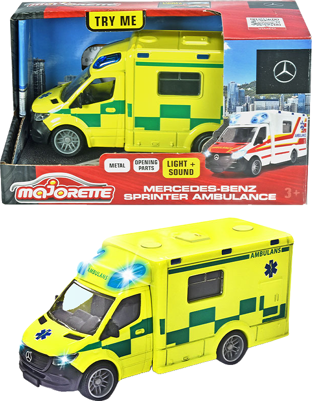 Majorette Mercedes-Benz Sprinter ambulans – hjälp finns till hands! När en olycka är framme måste räddningstjänsten vara på plats så fort som möjligt. Den här ambulansen i svensk modell har allt du behöver för att göra just det. Ambulansens tak har en siren, för att uppmärksamma närliggande trafik om att det finns en nödsituation. De två främre strålkastarna, blå varningsljus och ljudeffekter ser till att andra trafikanter ger plats direkt. Ambulansen har också genomskinliga fönster, så att fordonets interiör är synlig. Dessutom kan de bakre dörrarna öppnas för att lasta och lossa patienter. Förarhytten och lådkroppen är gjorda av metall och de andra delarna är gjorda av plast. Upptäck alla modeller från Majorette Grand Series i vår nya och större skala 1:43. Välj mellan räddningstjänst, bygg- eller stadsfordon – de spännande nya funktionerna och detaljrikedomen kommer garanterat att underhålla små barn. Batterier ingår (2xAAA). Mått:15 x 5,5 x 6,5 cm.