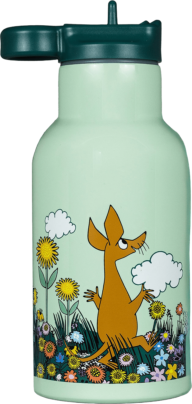Flaska i högkvalitativt stål med motiv från Mumin. Flaskan har en termofunktion som gör att vätskor kan hålla sig både varma och kalla ett litet tag. Inuti flaskan finns ett avtagbart sugrör i plast som gör att det kommer lagom mängd när man dricker. Flaskan är enkel att öppna och stänga. Handtaget gör det enkelt att ta med sig flaskan, även för de små. Både pip och sugrör finns att köpa som reservdel.