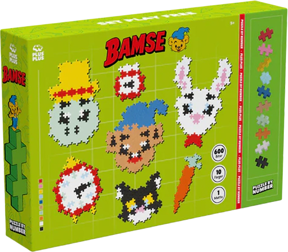 Bygg Bamse & Vännerna med Plus-Plus Puzzle by Number. Asken innehåller två mallar i olika svårighetsgrader. På den ena sidan matchar man färger med siffror, och på den andra finns en enklare version där bitarna placeras direkt på mallen utifrån färgerna.