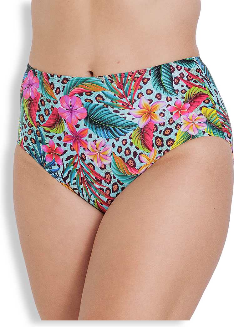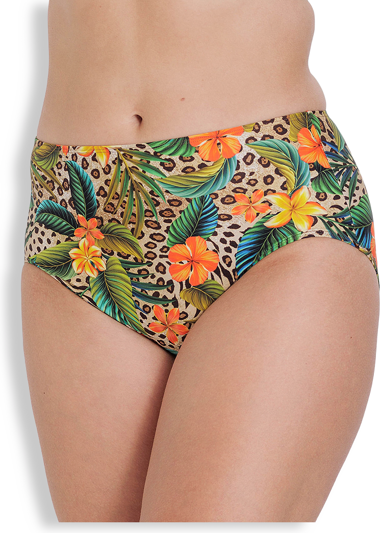 Perfekt sittande bikinitrosa. Helmönstrad fram och baksida i färgglatt växt- och djurmönstrat print. Klorresistent material som gör att plagget kan användas i simbassäng.Meshfodrat framstycke för en stabilare och tryggare känsla. 15 cm sidsöm i storlek 42. Fodrad gren. Bakom passformen ligger över 60 års expertis av att tillverka underkläder.