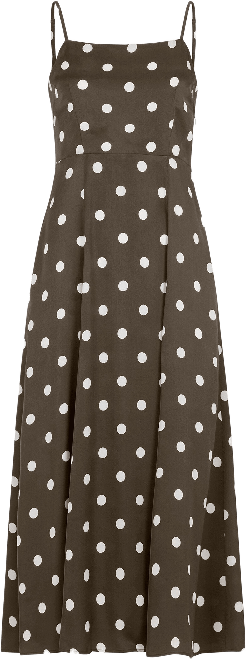 En nostalgisk och feminin klänning med smal överdel och utställd kjol. Modellen har fickor i sidsömmarna och justerbara axelband. En smockdetalj bak ger en smickrande passform. Tyget – ett diskret prickigt mönster från ett italienskt väveri – är en sann Newhouse-favorit och en klassiker i kollektionens historia. Klänningen är en del av Newhouse Jubileums kollektion.