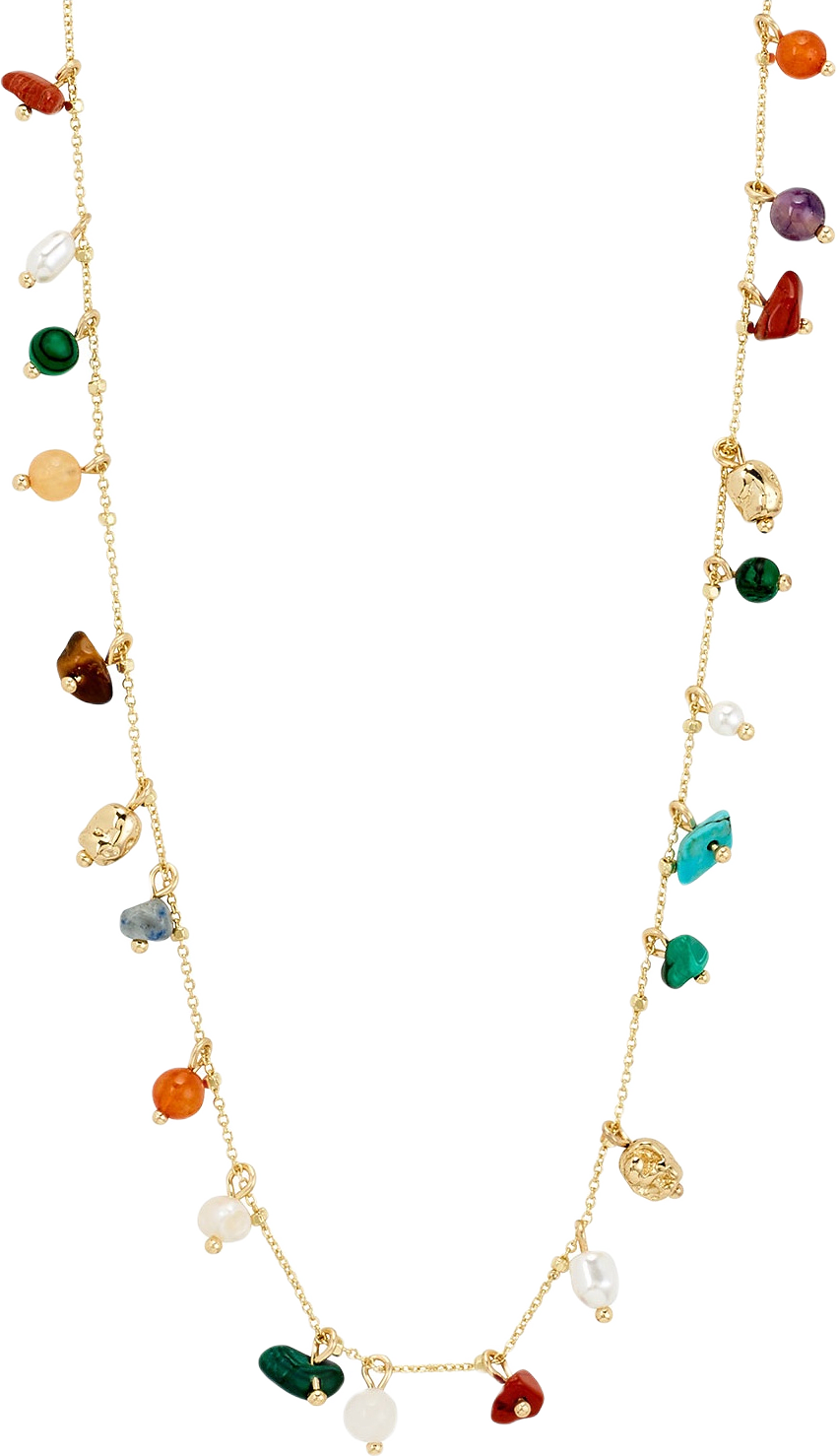 Between moments, new paths unfold! Introduce a touch of luxe boho to your appearance with Pilgrim's gold-plated BETWEEN necklace. Vibrant semi-precious stones like Amethyst, Malachite, Aventurine, Turquoise, Quartz, and Tiger Eye create a lively, grounded vibe - a must-have for those who love personality in their style. Pair it with a flowy dress, a chunky cardigan, and slouchy boots for an impressive boho-style look. The perfect accessory for an authentic and laid-back look.