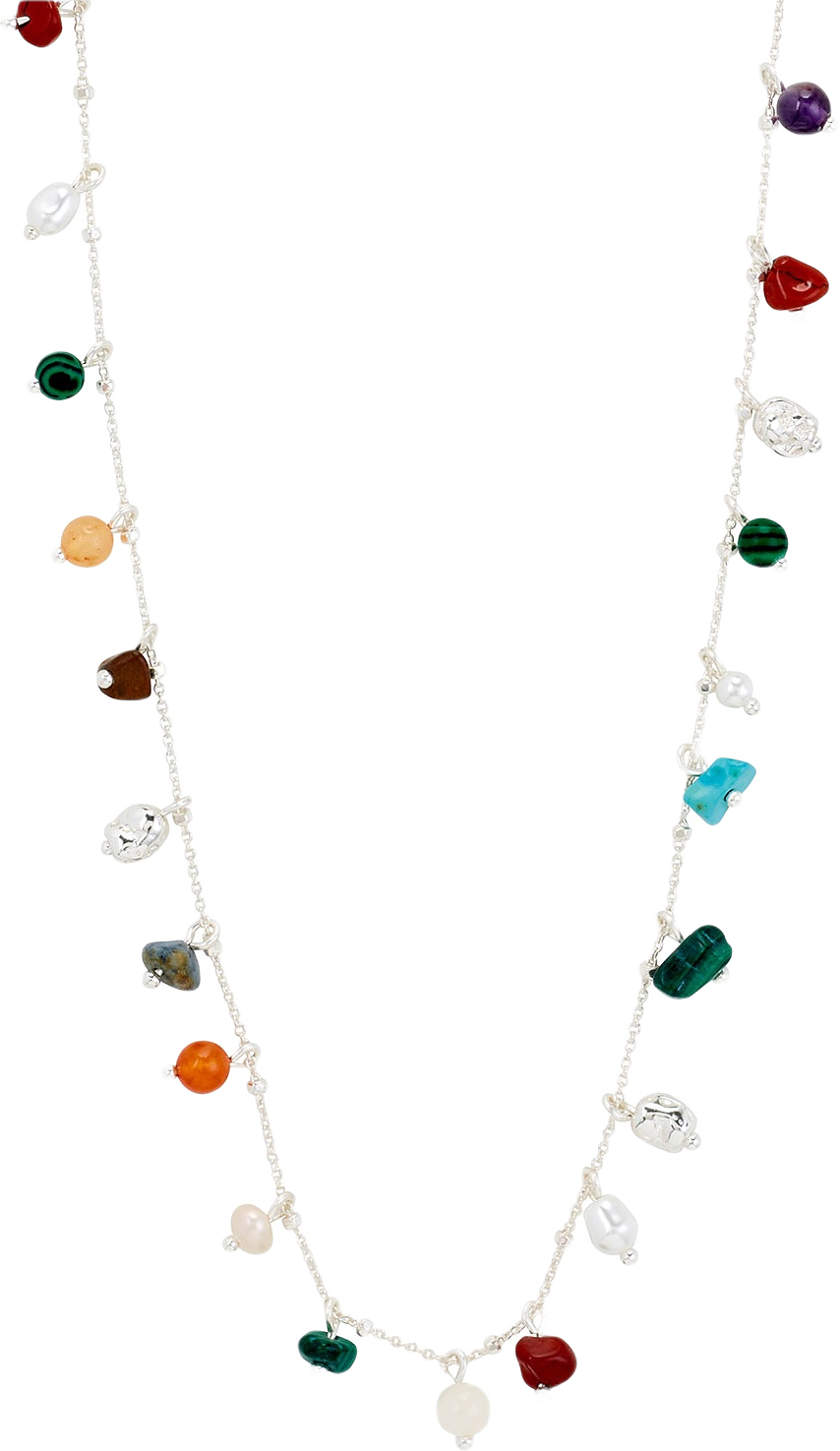 Between moments, new paths unfold! Elevate your look with a touch of luxe boho, courtesy of the silver-plated BETWEEN necklace from Pilgrim. Vibrant semi-precious stones like Amethyst, Malachite, Aventurine, Turquoise, Quartz, and Tiger Eye create a lively, grounded vibe - a must-have for those who love personality in their style. Pair it with a flowy dress, a chunky cardigan, and slouchy boots for an impressive boho-style look. The perfect accessory for an authentic and laid-back look.