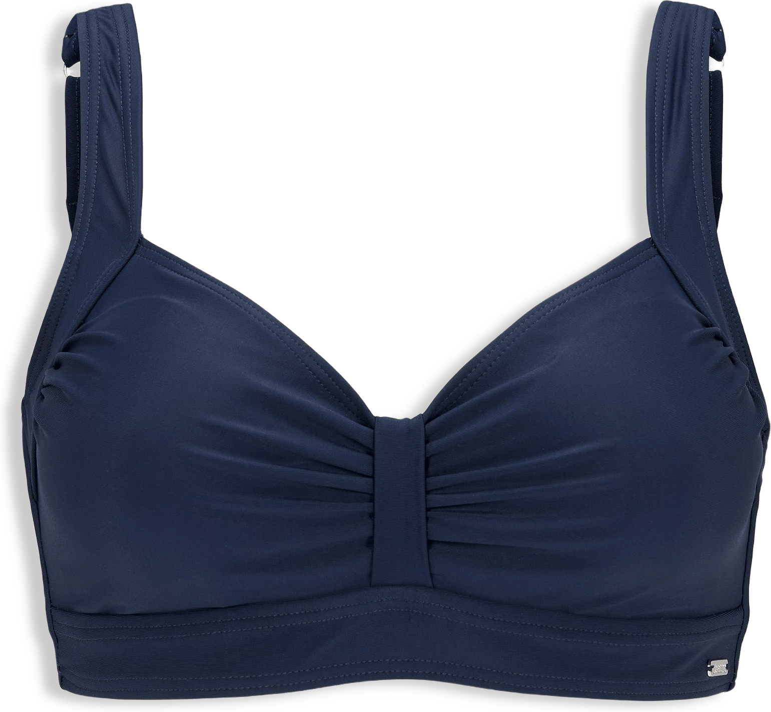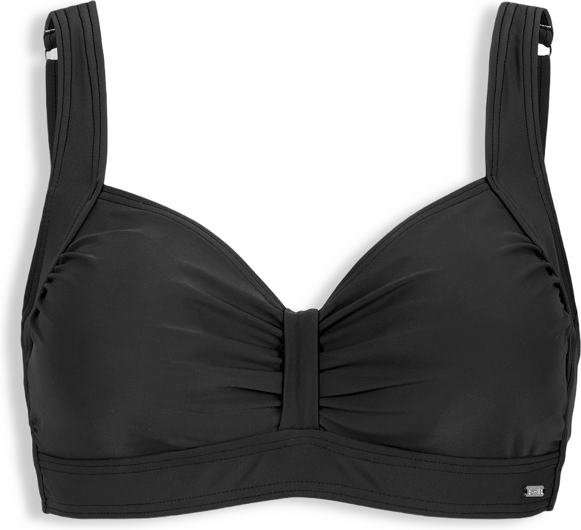 Vadderad bikiniöverdel i mjuk-bh modell gjord i återvunnen nylon. Täckande bikiniöverdel med protesficka. Vadderade kupor som är uttagbara för en mer personligt anpassad stil. Framtagen för att passa en större byst. Justerbara axelband med nickelfria ringar och spännen med knäppning bak. Mjuk och skön bikini-bh i en klassiskt färg - svart.
