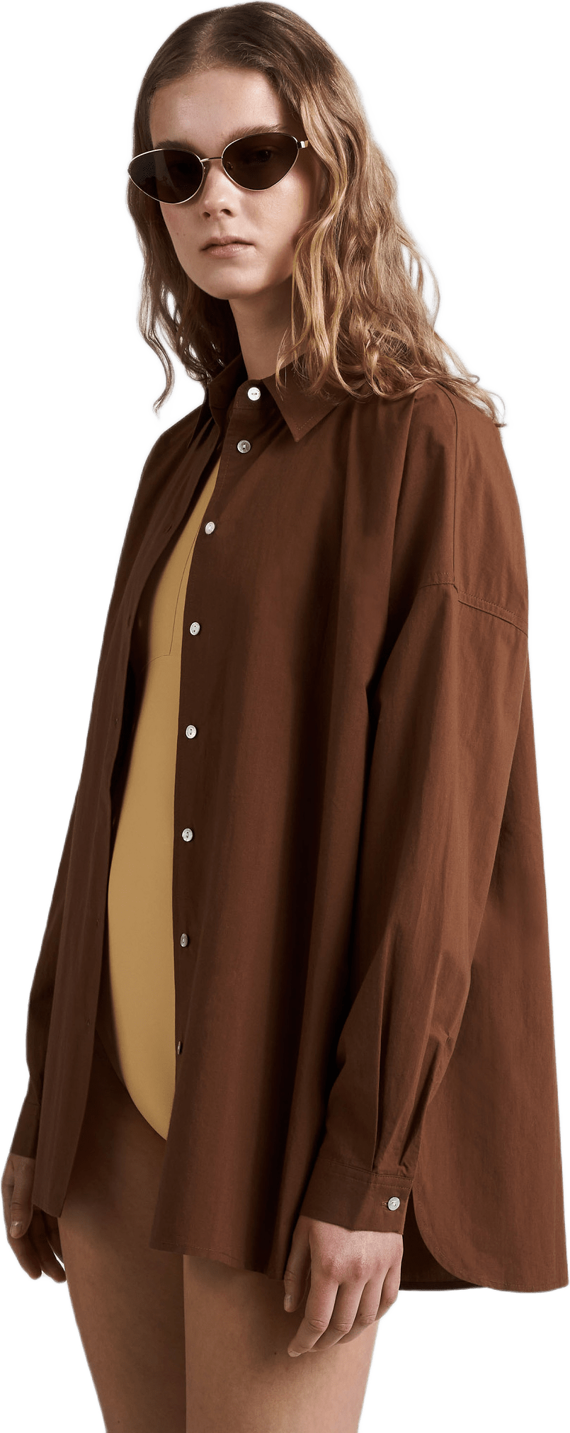 En oversize mellanbrun bomullsskjorta, många nummer mindre än min vanliga storlek. Snygg färg, hög kvalitet bomull. Jag har köpt en + en skjorta ( två köp)
