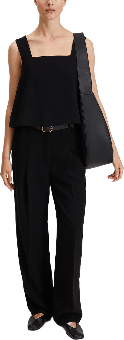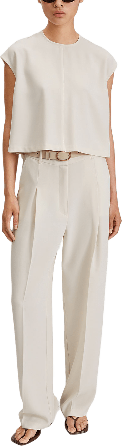 Introducing the Boville Trousers. These voluminous, full-length trousers are crafted from luxurious crepe fabric. Featuring a zip fly with a hidden button closure and a wide elastic waistband at the back for added comfort. Slanted side pockets and front pleats create a sophisticated silhouette, complemented by back darts for a tailored fit. Finished with crease lines at the center of the leg, both front and back.