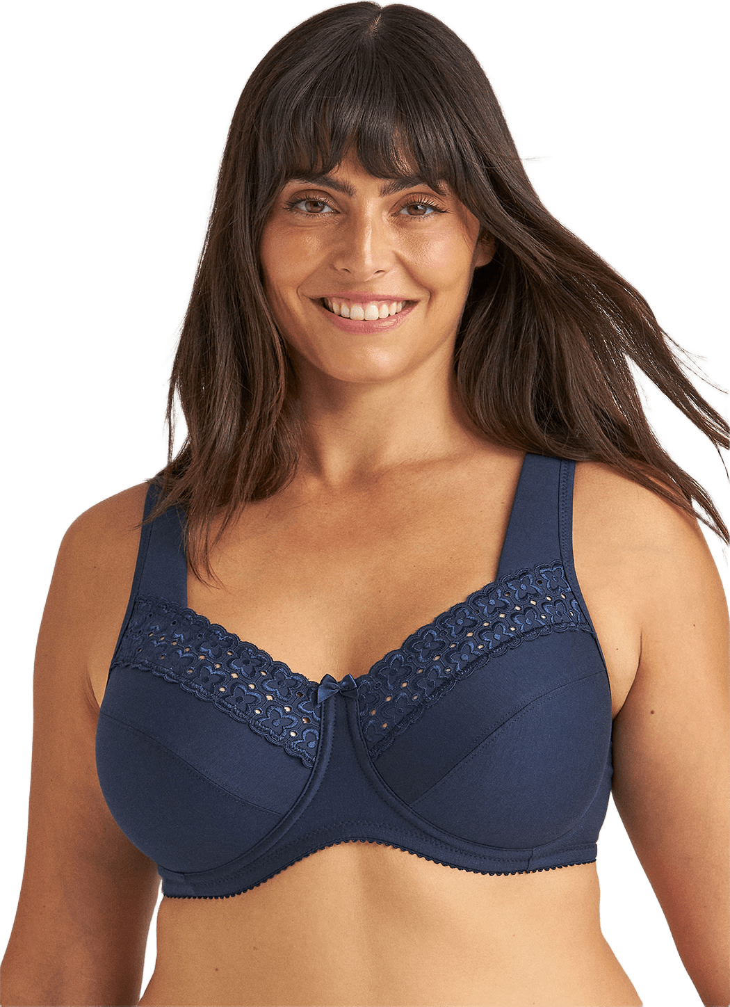 Broderie Anglaise, vår klassiska bomulls-bh finns nu med bygel. Ovadderad och ofodrad helkupa med tvådelad skärning som är dekorerad med engelsk brodyr, formar bysten naturligt rund. Ger stöd och lyft upp till H-kupa. Vår fina bomull är ett naturmaterial som lämpar sig mycket bra för underkläder eftersom det både är lättskött och slittåligt. Det tåls att tvätta många gånger utan att tappa varken i form eller kvalitet. Breda, vadderade axelband ger långvarig komfort och avlastning. Elastisk rygg med reglerbar hak- & hyskknäppning.