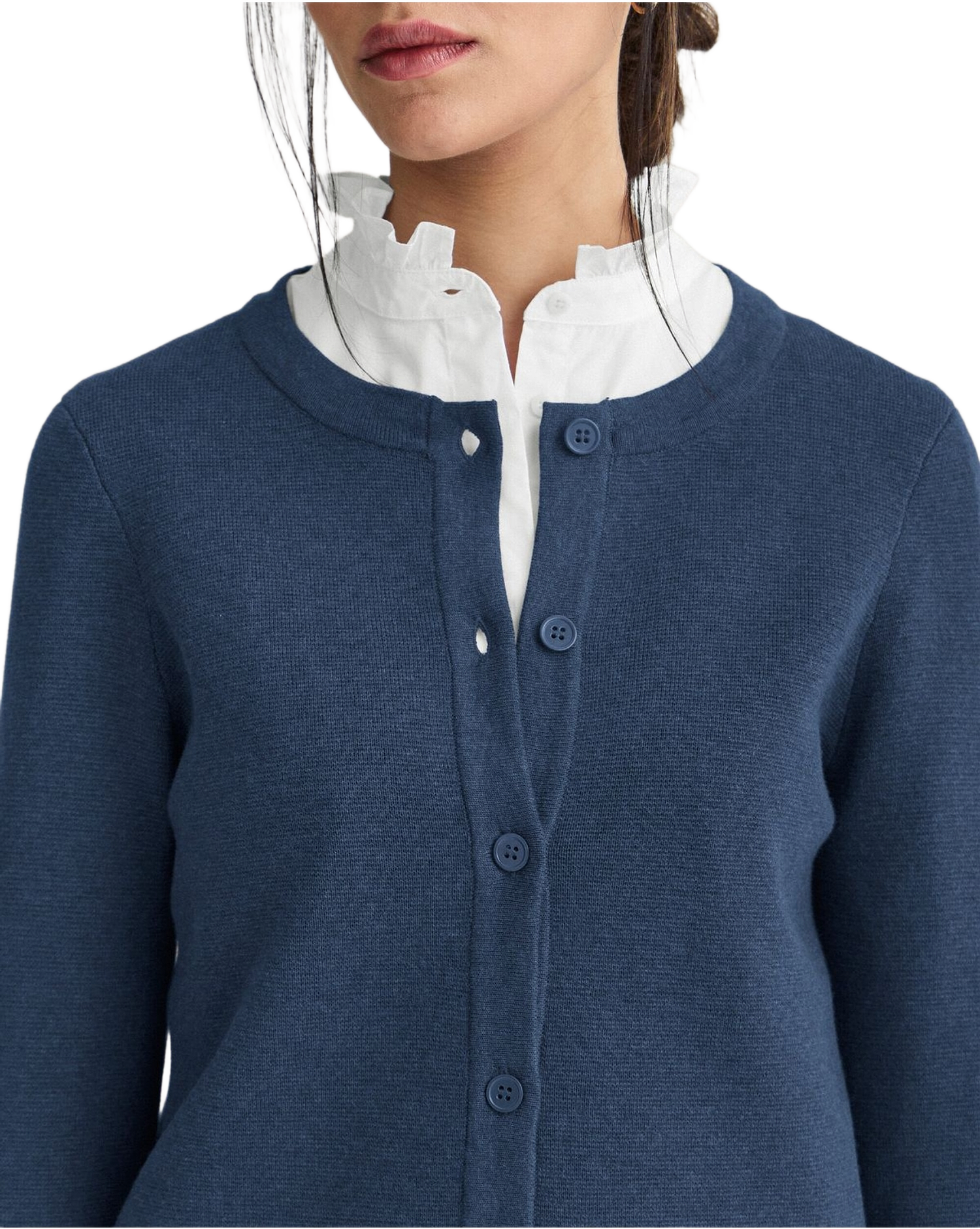 Stickad cardigan i 12 gauge Milanostickning. Koftan knäpps med 6 stycken pärlemorknappar och har ett litet tonalt logobroderi på ena sidan fram. Bär den gärna som en liten jacka över en skjorta eller blus.