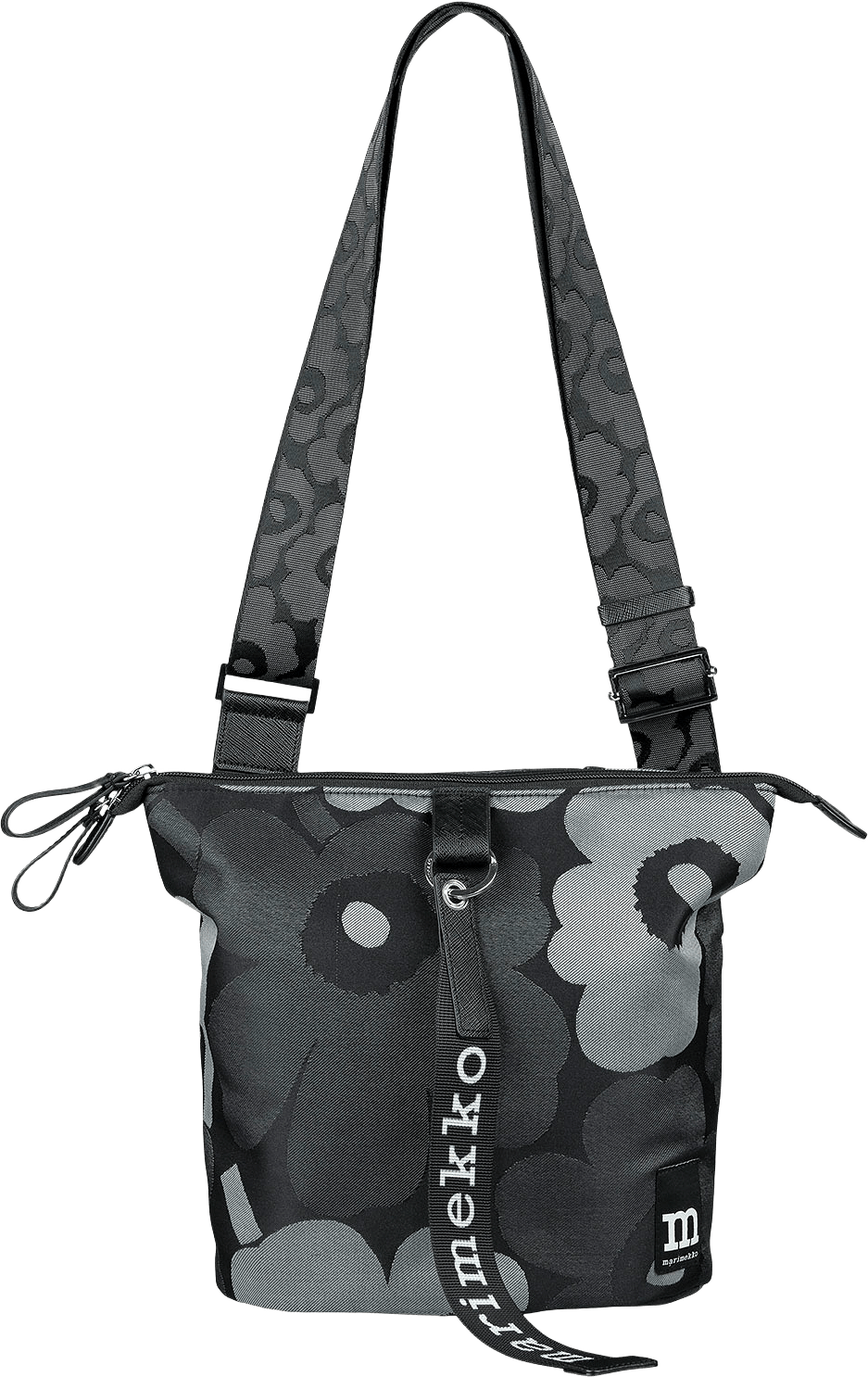 The Carry All Unikko shoulder bag has a zipper closure, a handle, and an adjustable, jacquard knit Unikko pattern shoulder strap. There is an open pocket on the inside and an open pocket on the outside. The Marimekko keychain is attached to the front.