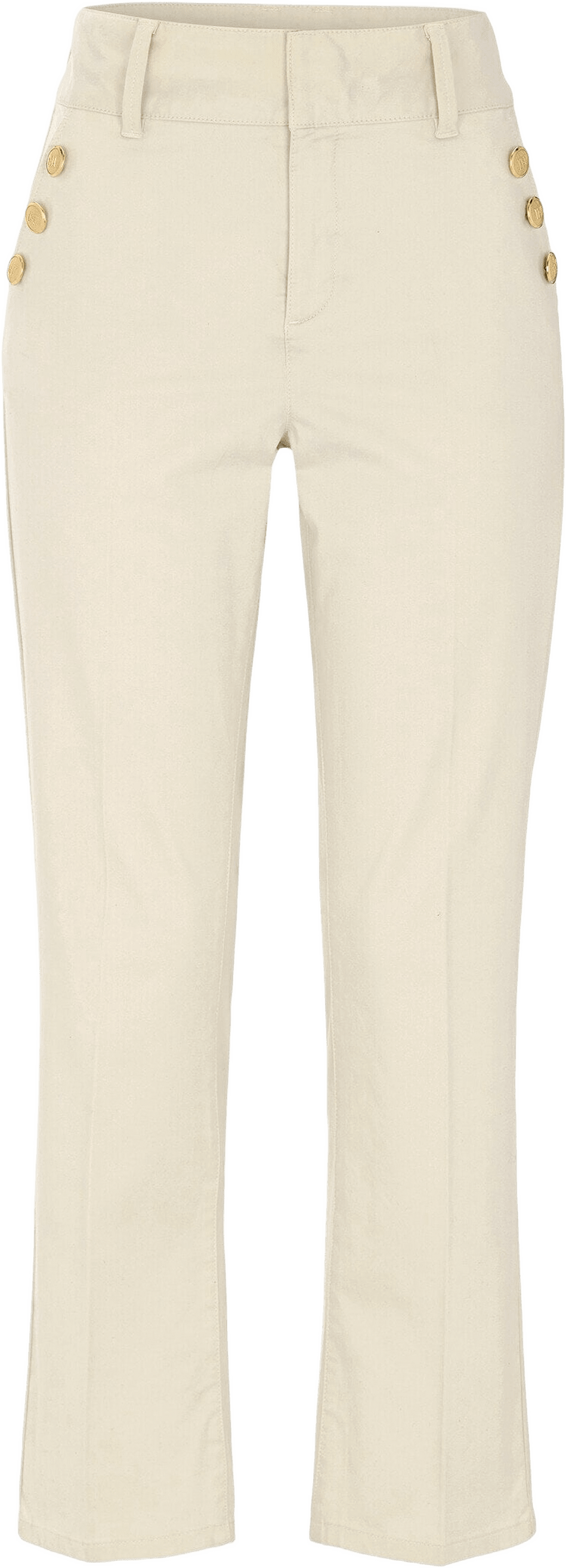 Byxa i bomullssatin med stretch. Byxan har en normal midja och smal benvidd med en lätt flare nedtill. Snedställda fickor fram med logoknappar i guld. Stängs med hake och hyska i midjan.