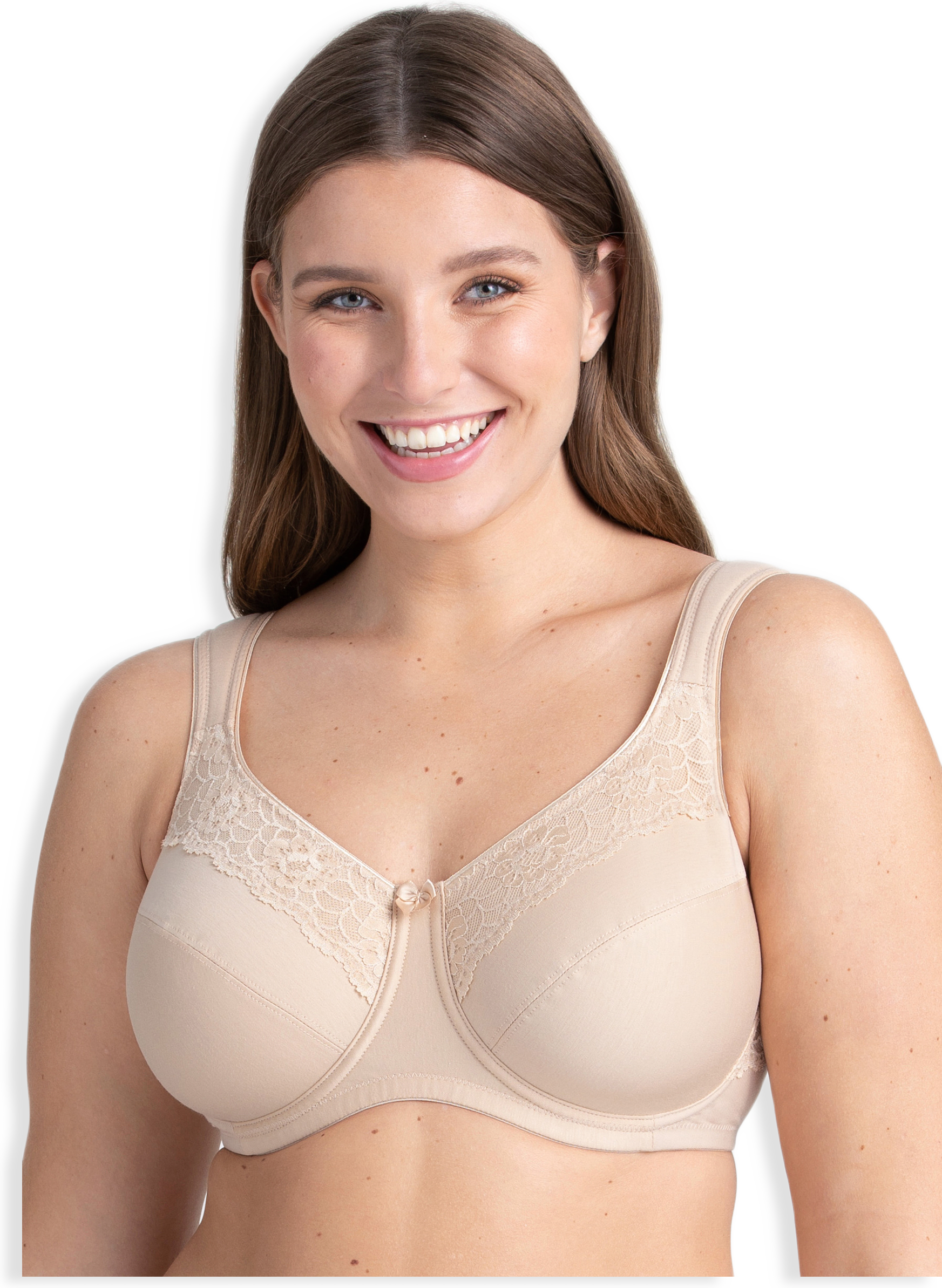 Minimizer bygel-bh i bomull. Ger bra stöd och formar bysten rund. Dekorativa spetsdetaljer på överkupan samt i sidan tillför det lilla extra. Mjuk bomull ger en naturlig sval känsla och låter huden andas. Perfekt under sommardagar. Ovadderad och ofodrad kupa med diskreta och platta kupsömmar. Ett bra alternativ till en sömlös kupa om man vill ha en 'osynlig' look under kläder.  Vadderade, reglerbara komfortaxelband avlastar axlarna. Elastisk u-formad rygg i bomull/elastan med justerbar hak- & hyskstängning.