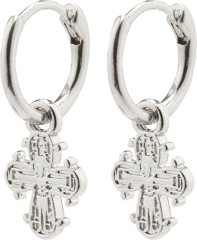 Små, silverpläterade huggie hoops med mini-Dagmarkors, till största del tillverkade i återvunnet material. Dagmarkorset betraktas som en av Danmarks största nationalklenoder, och det är det närmaste man kommer ett nationalsmycke. I Danmark är det tradition att ge Dagmarkorset som dop- eller konfirmatiotnsgåva – den vackra symbolen kan användas i alla sammanhang. Pilgrim har skapat en ny version av det klassiska Dagmarkorset och har här kombinerat det med ett par små, silverpläterade huggie hoops i en uppdaterad, söt look.