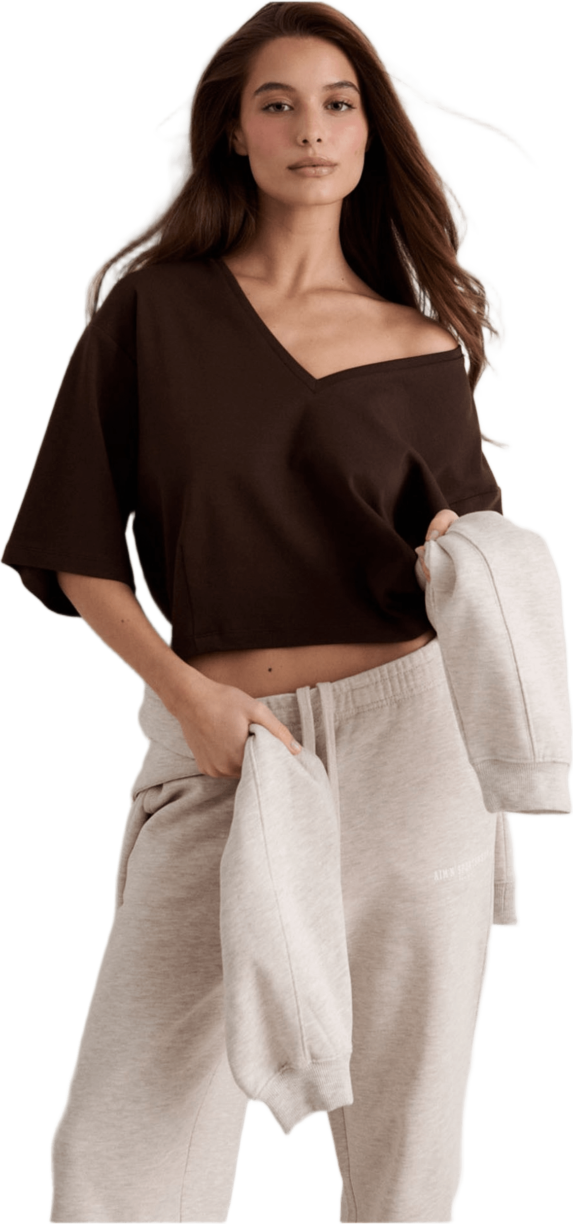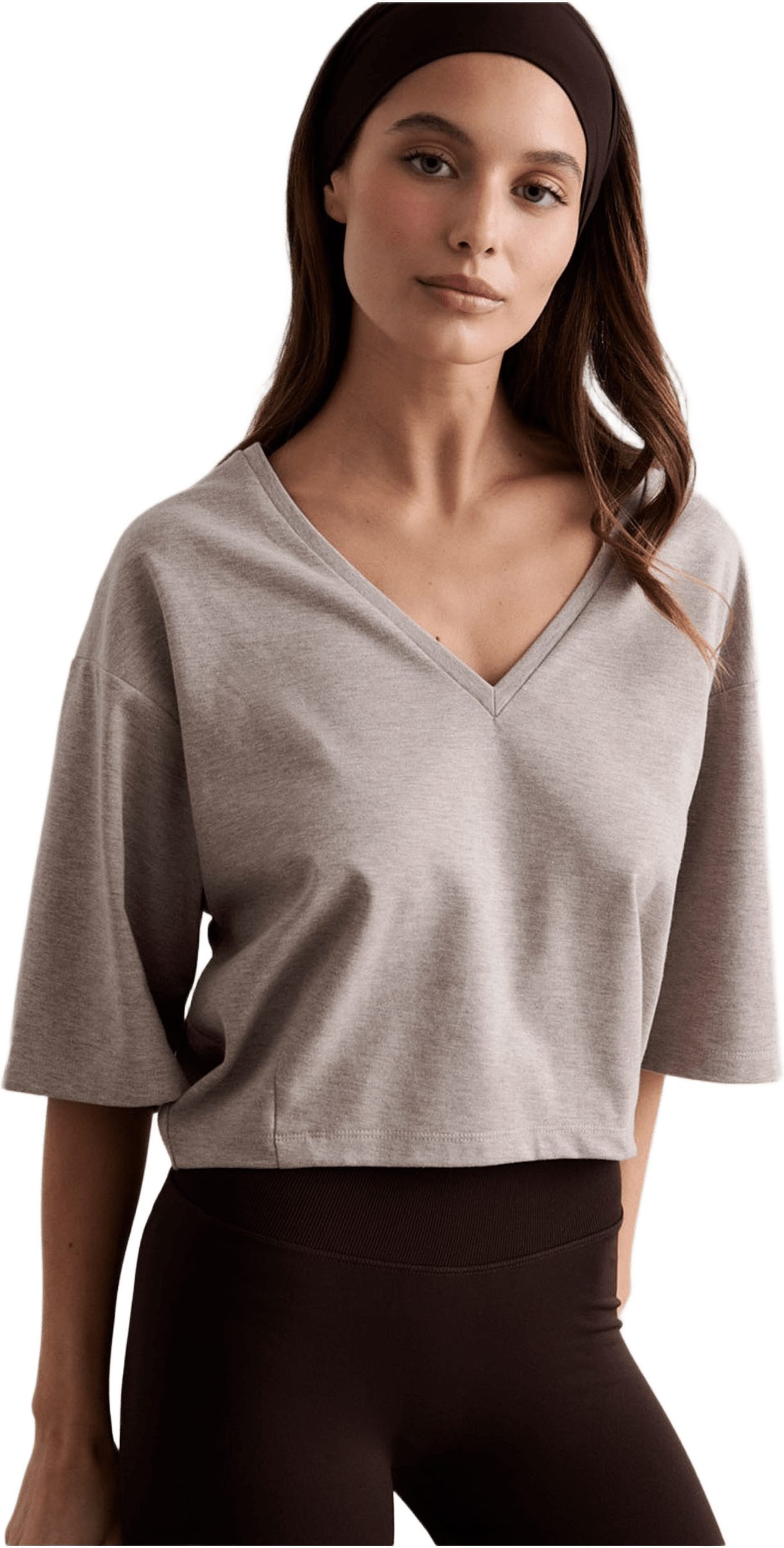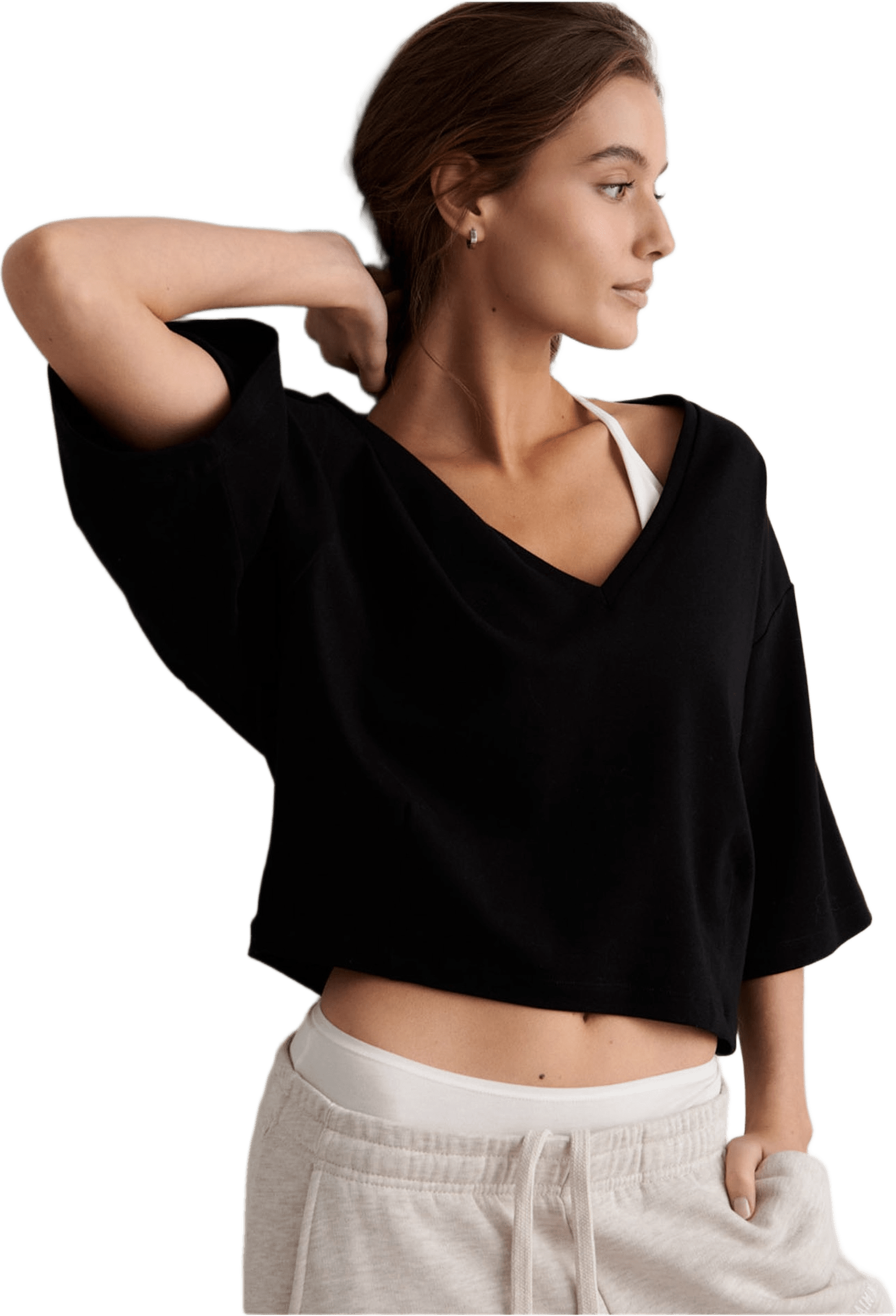 Elevated T-Shirt features a relaxed, slightly cropped fit with a flattering V-neckline for an effortless look. The t-shirt is made from a soft interlock jersey (100% cotton). The breathable cotton t-shirt has wide sleeves.