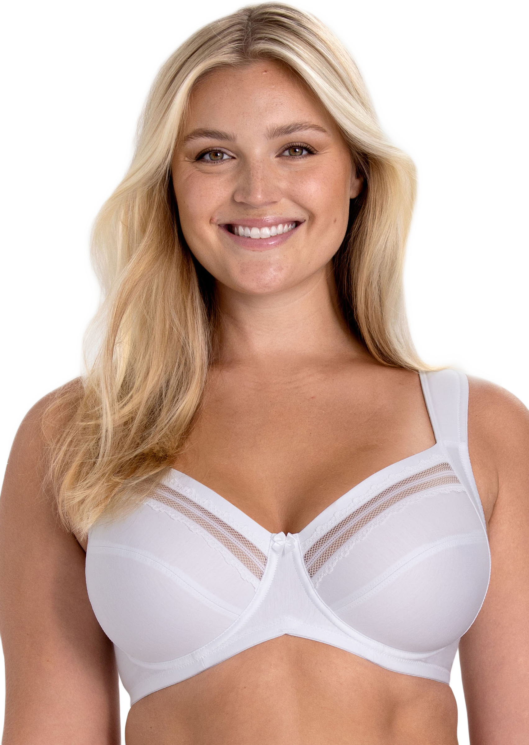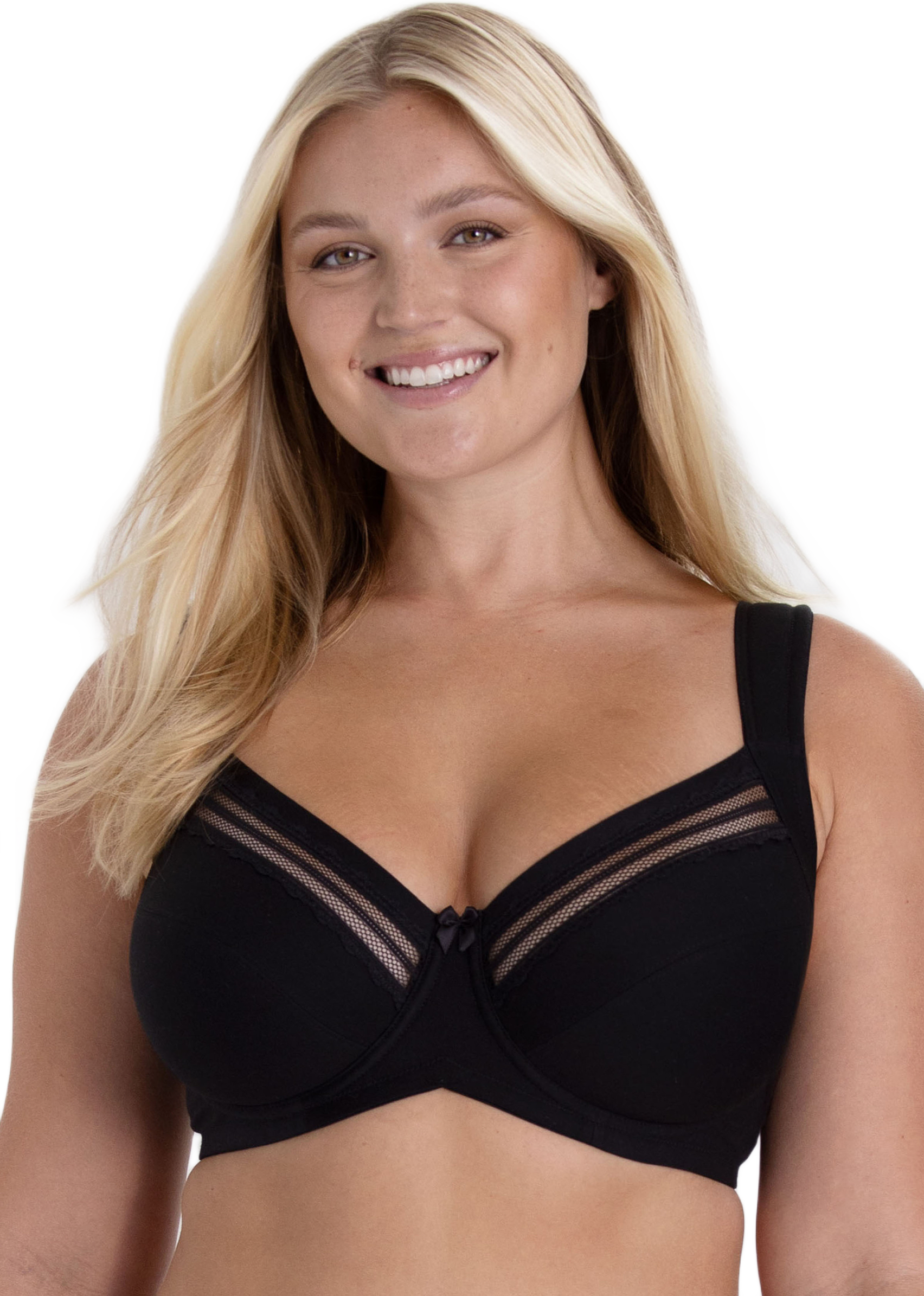 Slät bomulls-bh i stilren look med spetsdetaljer på kupan. Perfekt bas-bh för veckans alla dagar. Ovadderad och ofodrad kupa som formar bysten rund. Bh:n har bygel för att ge extra bra stöd. Platta och diskreta kupsömmar syns mindre under kläder. Upphöjd nederkant framtill ger ökad komfort när man sitter ner då den inte trycker mot diafragman. Reglerbara, vadderade komfortaxelband avlastar trötta axlar. Elastisk u-formad rygg med justerbar hak- & hyskknäppning.