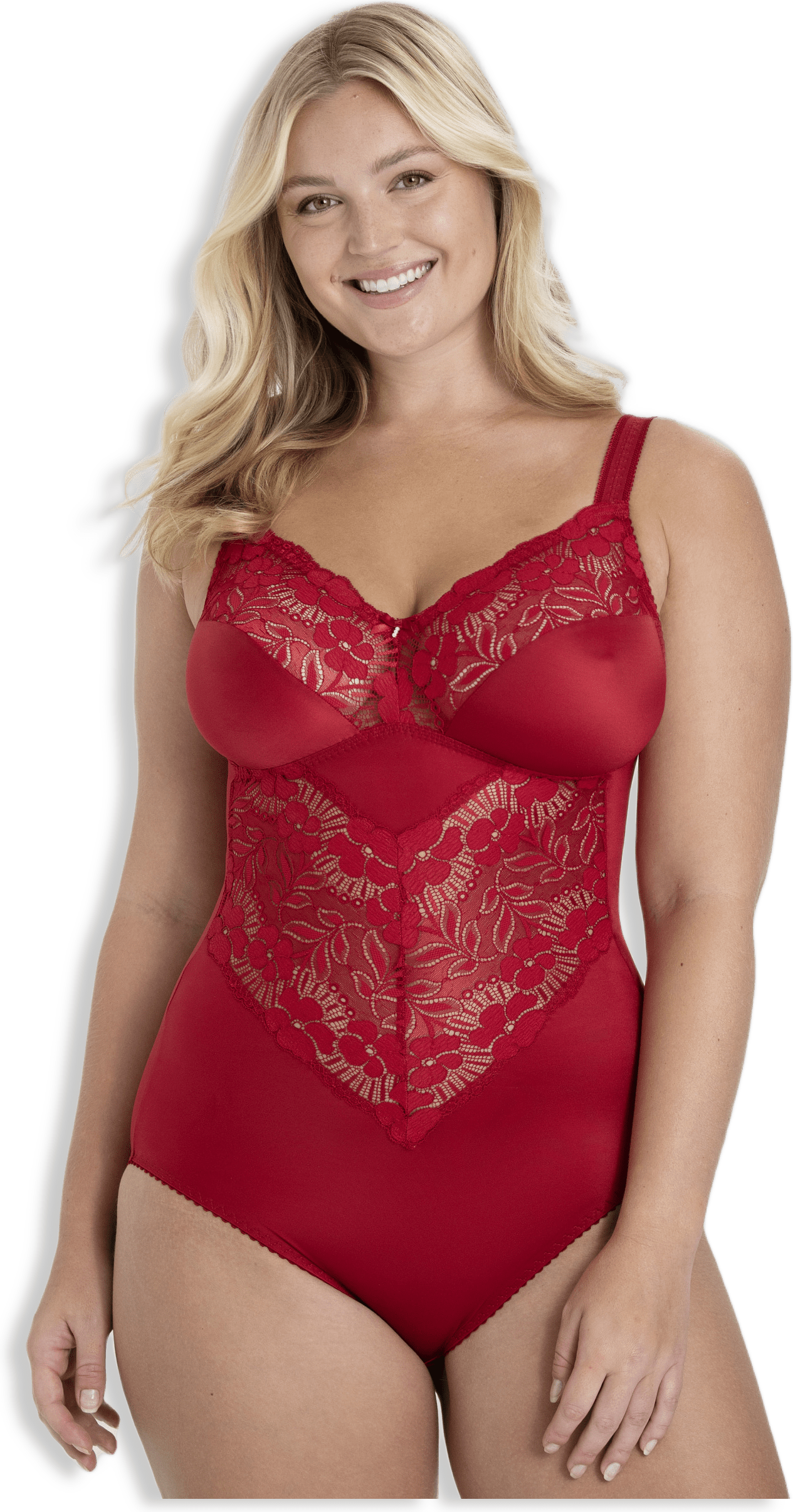 Utsökt mönstrad stretchspets, ovadderad och ofodrad kupa utan bygel tillför en nätt känsla till denna sofistikerade body med mjuk stretchsupport. Bodyn har en smickrande skärning som framhäver dina kurvor. De reglerbara axelbanden är dekorerade med rynkad spets. Bomullsfodrad gren med justerbar hak- & hyskknäppning.
