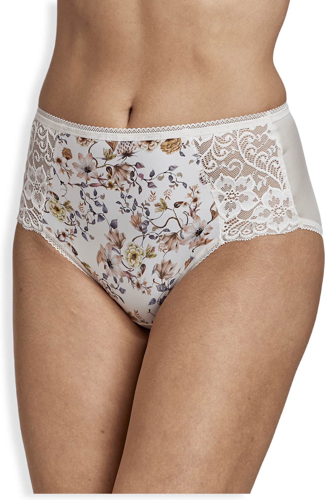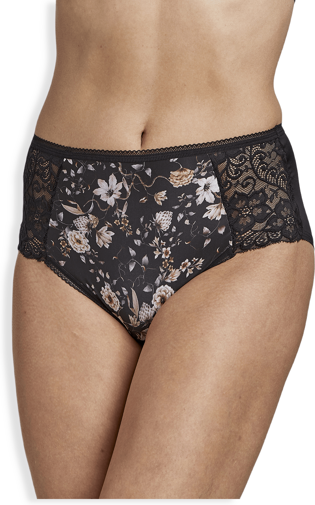 Nätt ofodrad trosa med mjuk microkänsla. Mönstrad framsida med infällda spetsdetaljer. Slät baksida. Mjukt resårband i midja och benöppning. Bomullsfodrad gren.