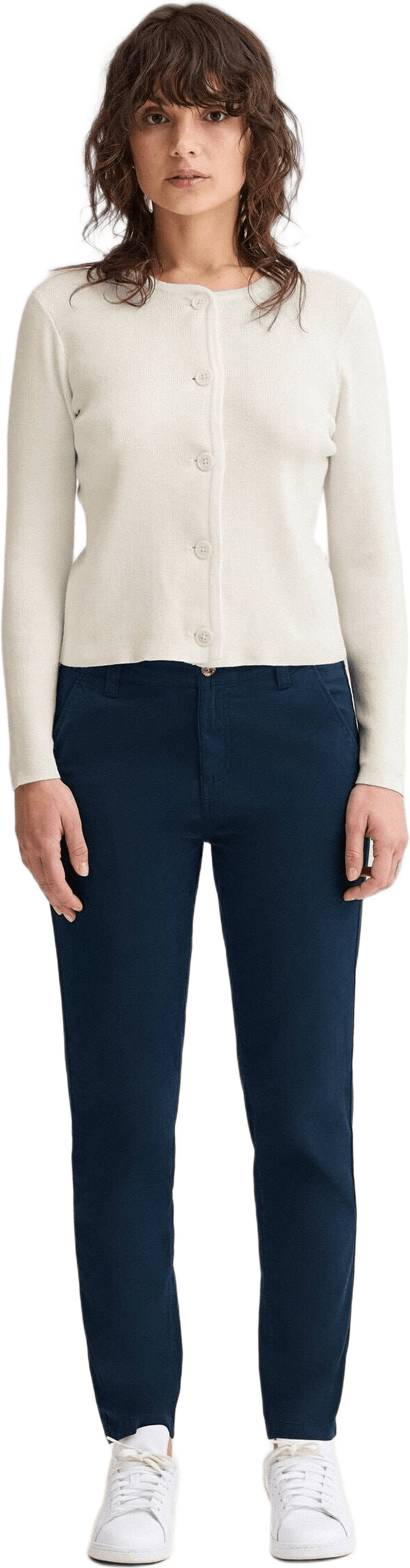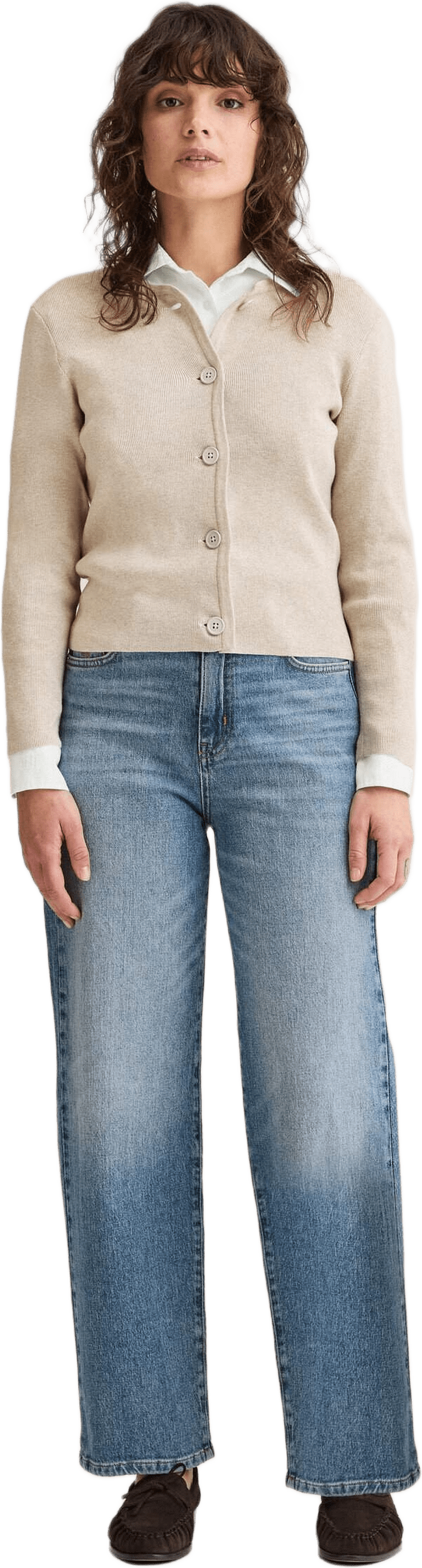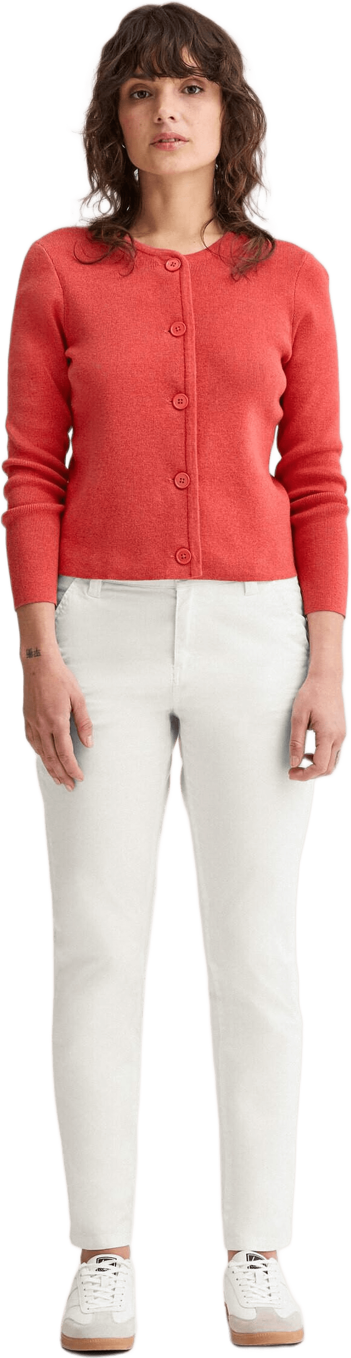 Ribbstickad kofta med smal passform. Stickad i 12 gauge för en tunn och följsam struktur. Tillverkad i 100 % bomull. Knäpps med ton-i-ton pärlemorknappar.