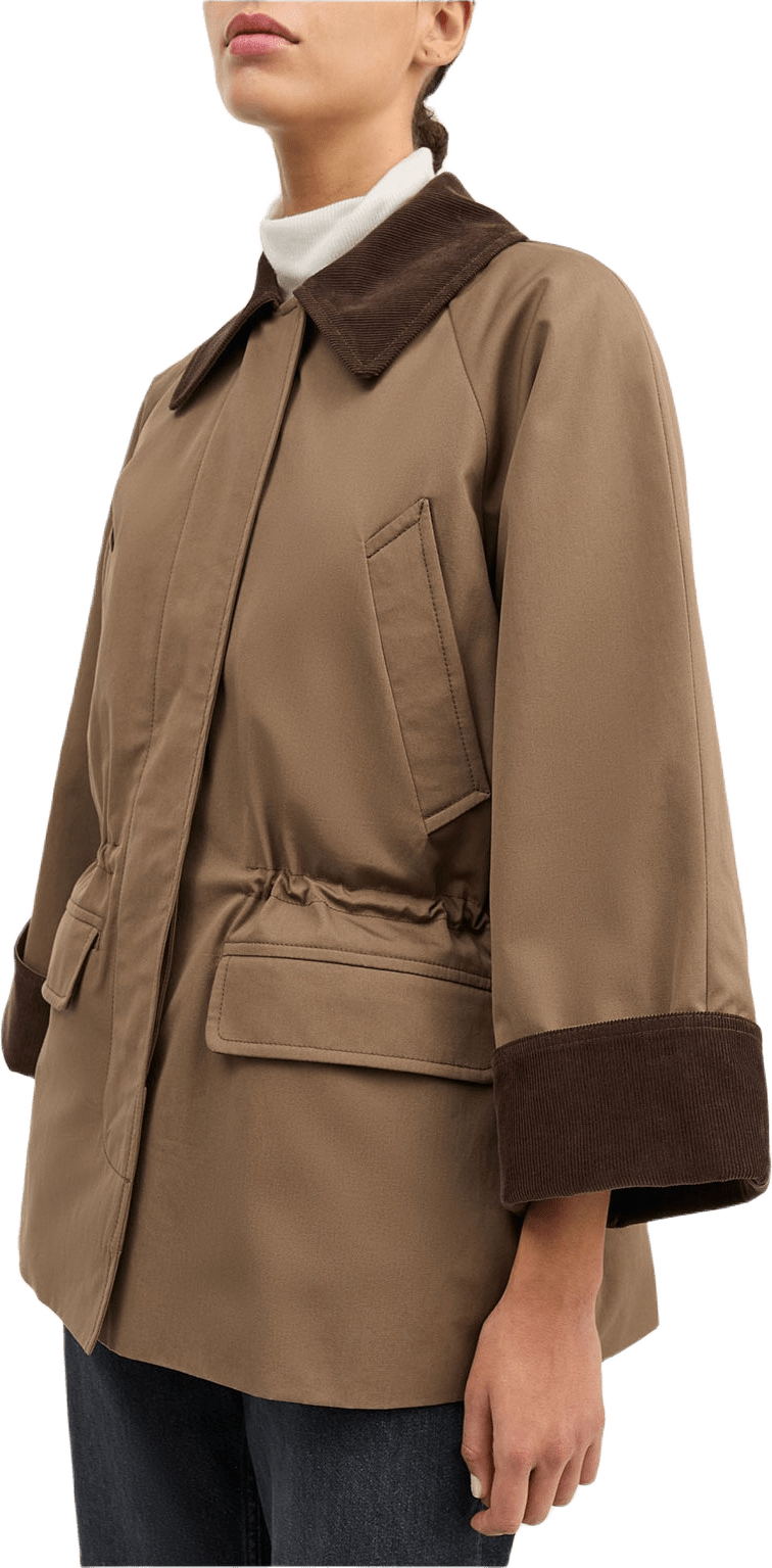 The Gaby jacket is made in a water repellent organic cotton. The jacket has an oversize fit with an adjustable elastic drawstring in the waist and is inspired by the English country style. It is designed with a round neck opening and a hidden placket with push buttons and closes with a zipper. It has four pockets on the front, one pocket inside and a quilted lining. The wide raglan sleeves has corduroy details on the inside of the cuffs. The same corduroy details adorn the collar and the inside of the pockets.