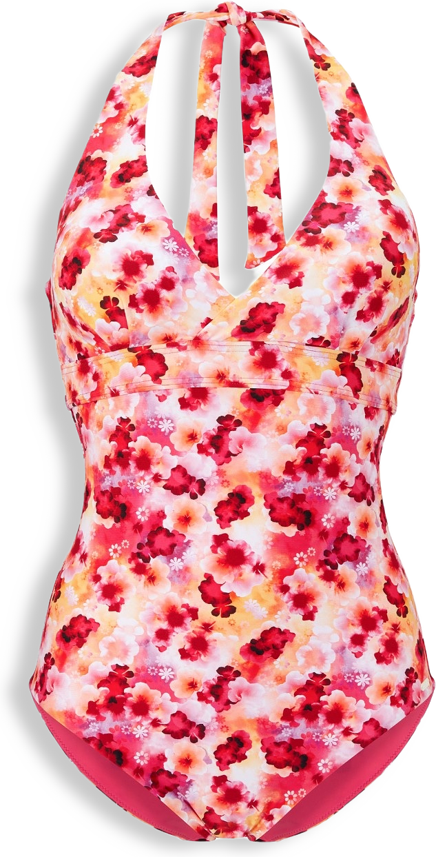 Baddräkten Haiti i halterneckmodell i härliga mönstret Pink crush - en uppiggande baddräkt att trivas i. Denna baddräkt i återvunnet material har axelband som knyts i nacken - vilket gör den enkel att ta på och av. Tack vare ett helfodrat framstycke ger dig denna baddräkt en smickrande siluett och en härlig passform. Även kuporna är helfodrade och har uttagbar vaddering. Runt benöppningen är den en mjuk och bekväm resår som skapar en skön komfort och som hjälper baddräkten att sitta på plats.