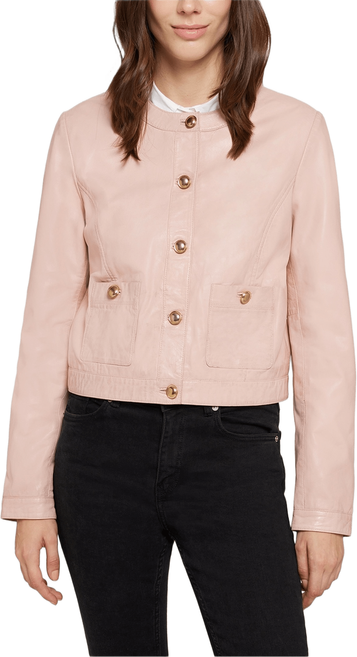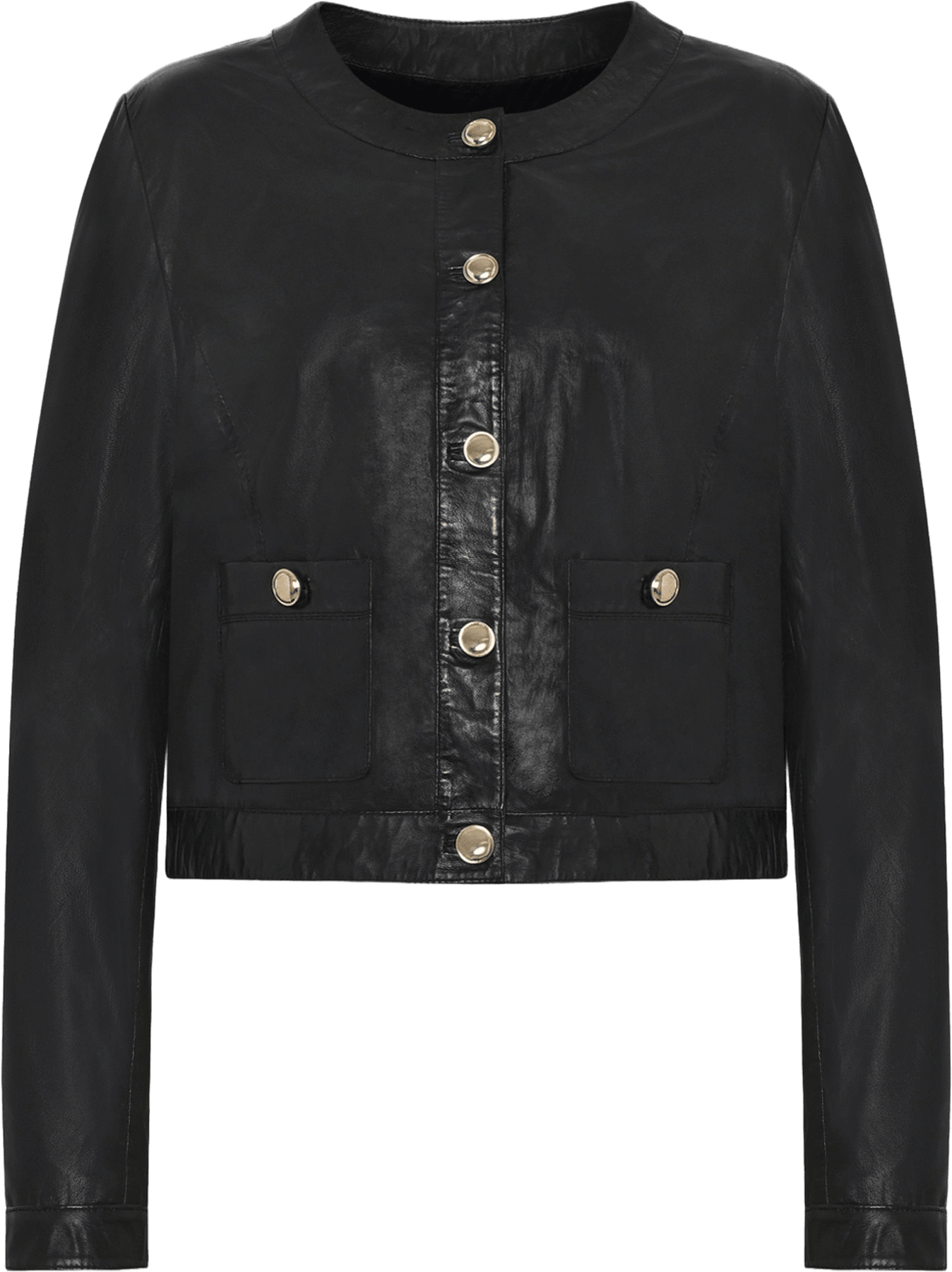 Halo är en tidlös och elegant skinnjacka som ger det lilla extra till varje outfit. Bär den som en kavaj eller jacka, beroende på säsong. Designad med en rund halsringning, guldtonade knappar framtill och två påsydda fickor fram.