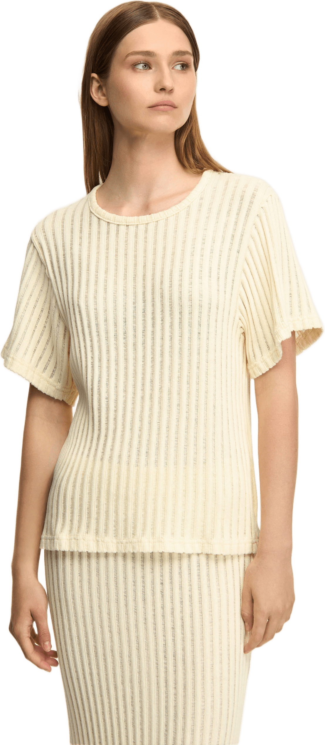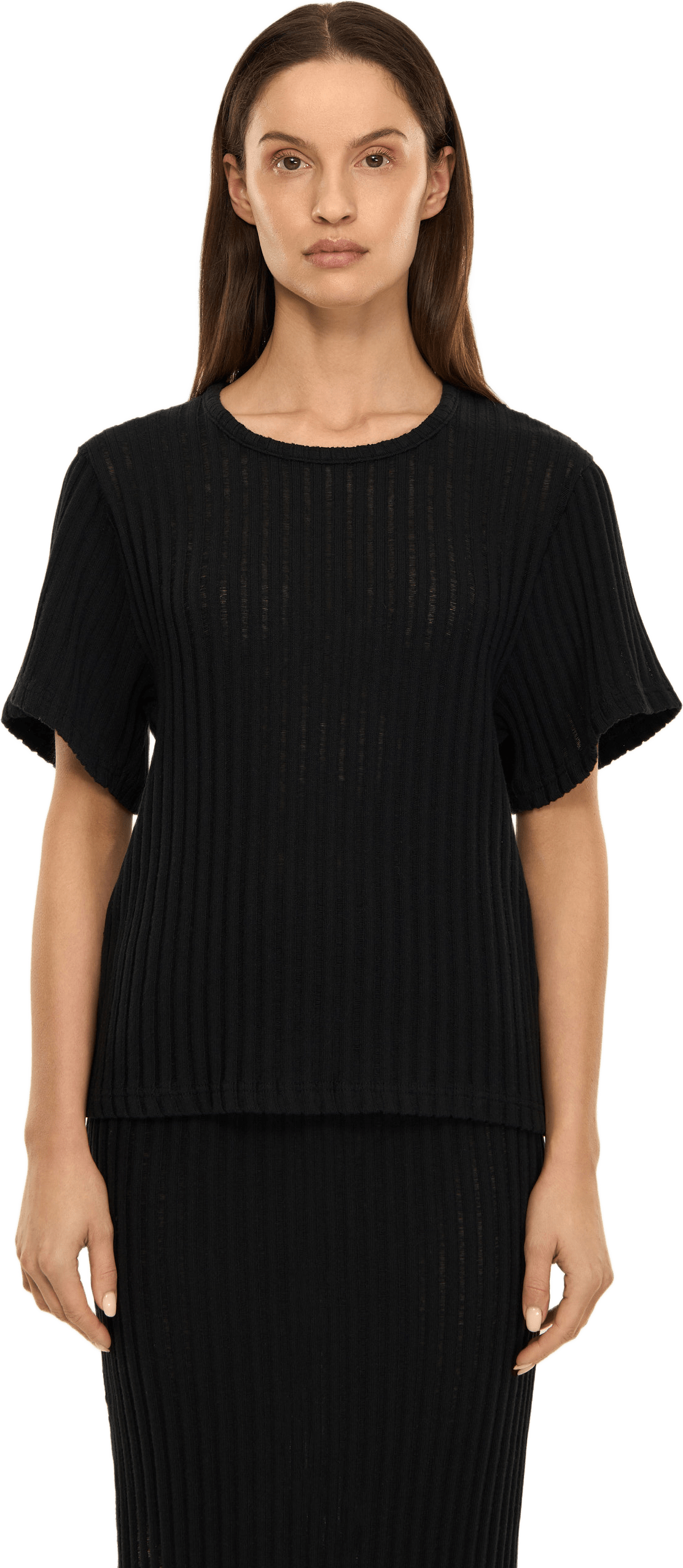 Henny är en ribbstickad tröja i Fantasy Rib – ett mjukt, ekologiskt bomullstyg med följsam stretch. Det subtila hålstickade mönstret adderar struktur och rörelse, medan den avslappnade passformen gör den lika bekväm som stilren. Perfekt till vardags eller i set med Mait. Modellen på bilden är 174 cm lång, har ett bröstmått på 85 cm och bär storlek S. Längd på plagget i storlek S: 60 cm.