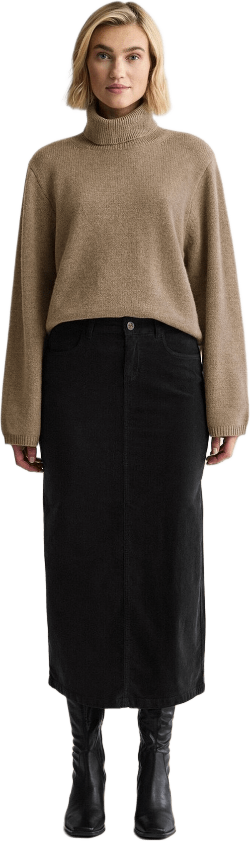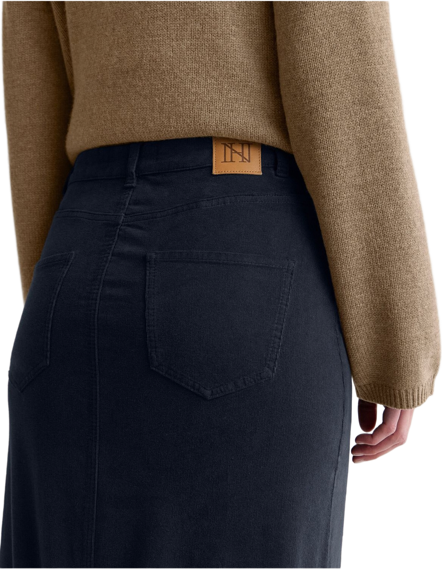 Smalspårig manchesterkjol i femficksmodell, tillverkad i mjuk minicord. Kjolen har en hög slits mitt bak och längden på kjolen är 90 cm i storlek 38.