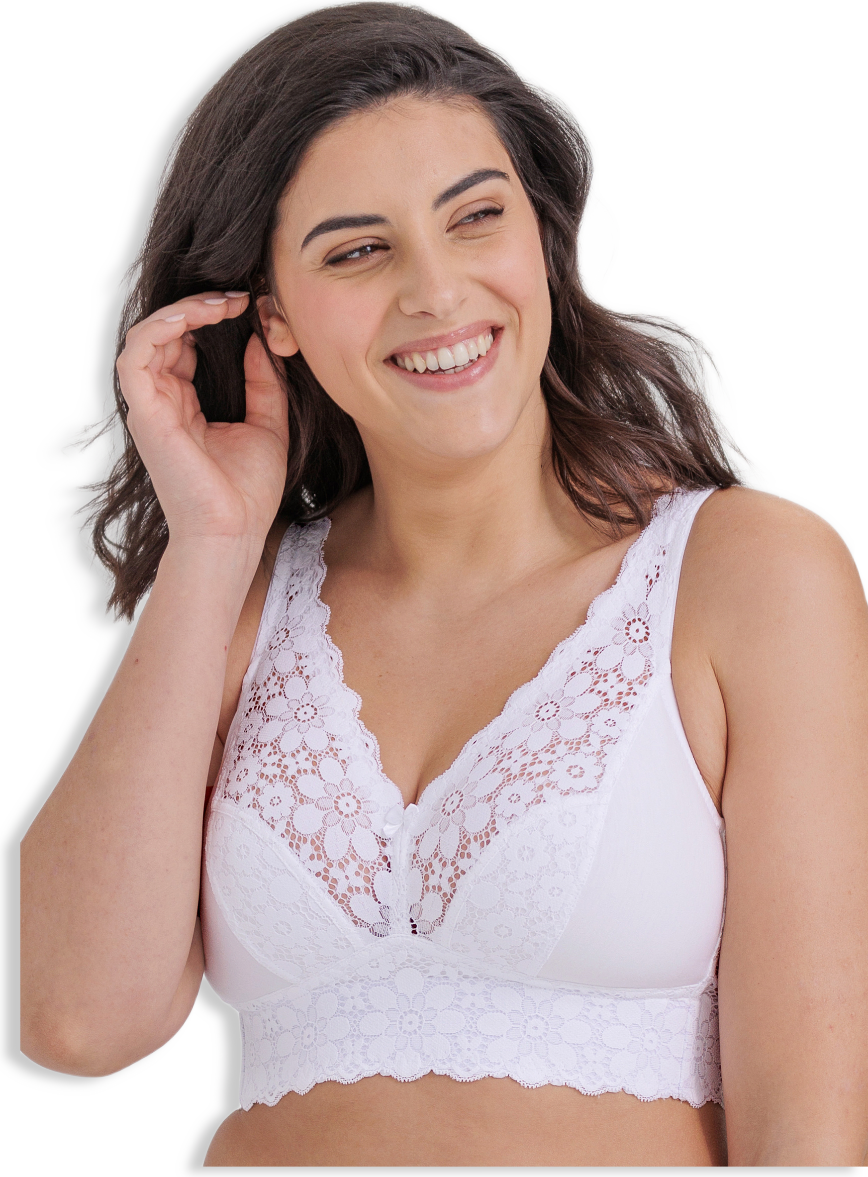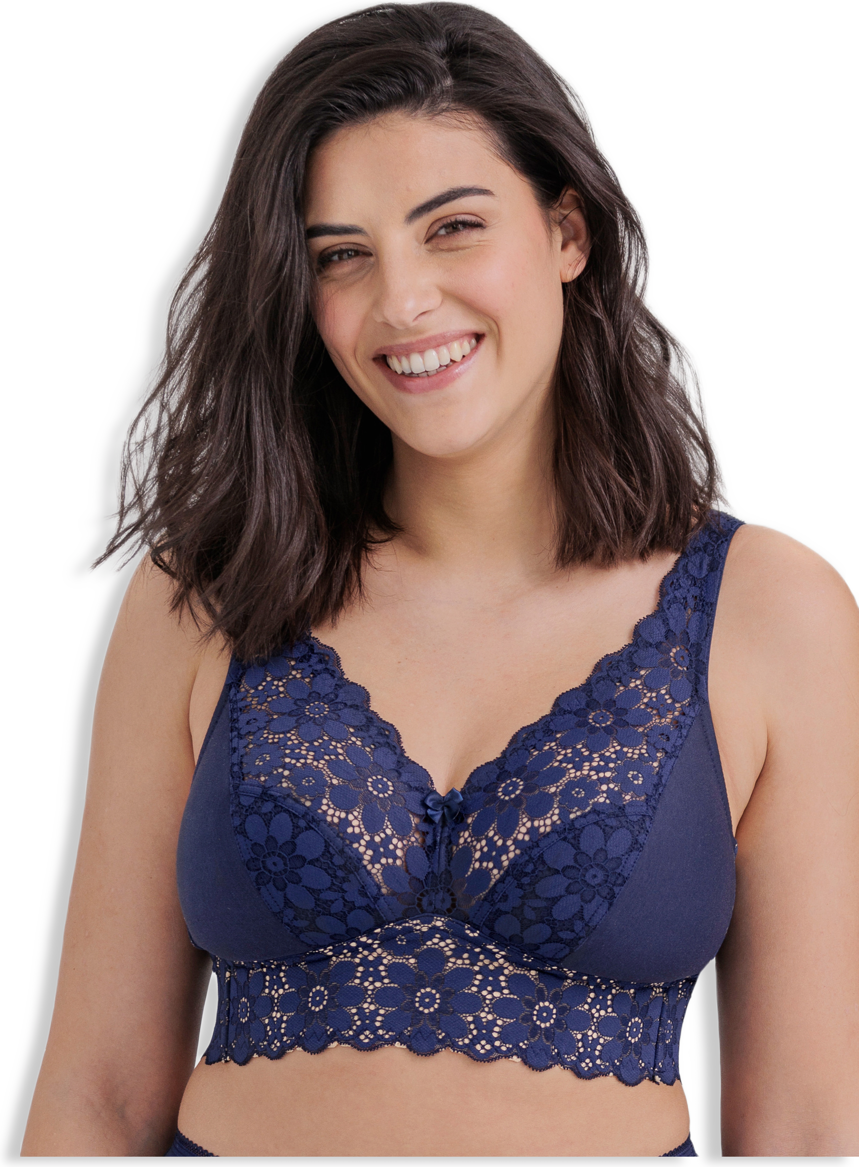 Skön bygelfri bh med underkupa i bomull och överkupa i elastisk återvunnen spets. Brett resårband i nederkant för extra komfort (beigefärgat i den mörkblå). Justerbara stretchaxelband. Rygg i bomullsfodrad återvunnen spets, ger extra stadga med justerbar hak- & hyskknäppning.