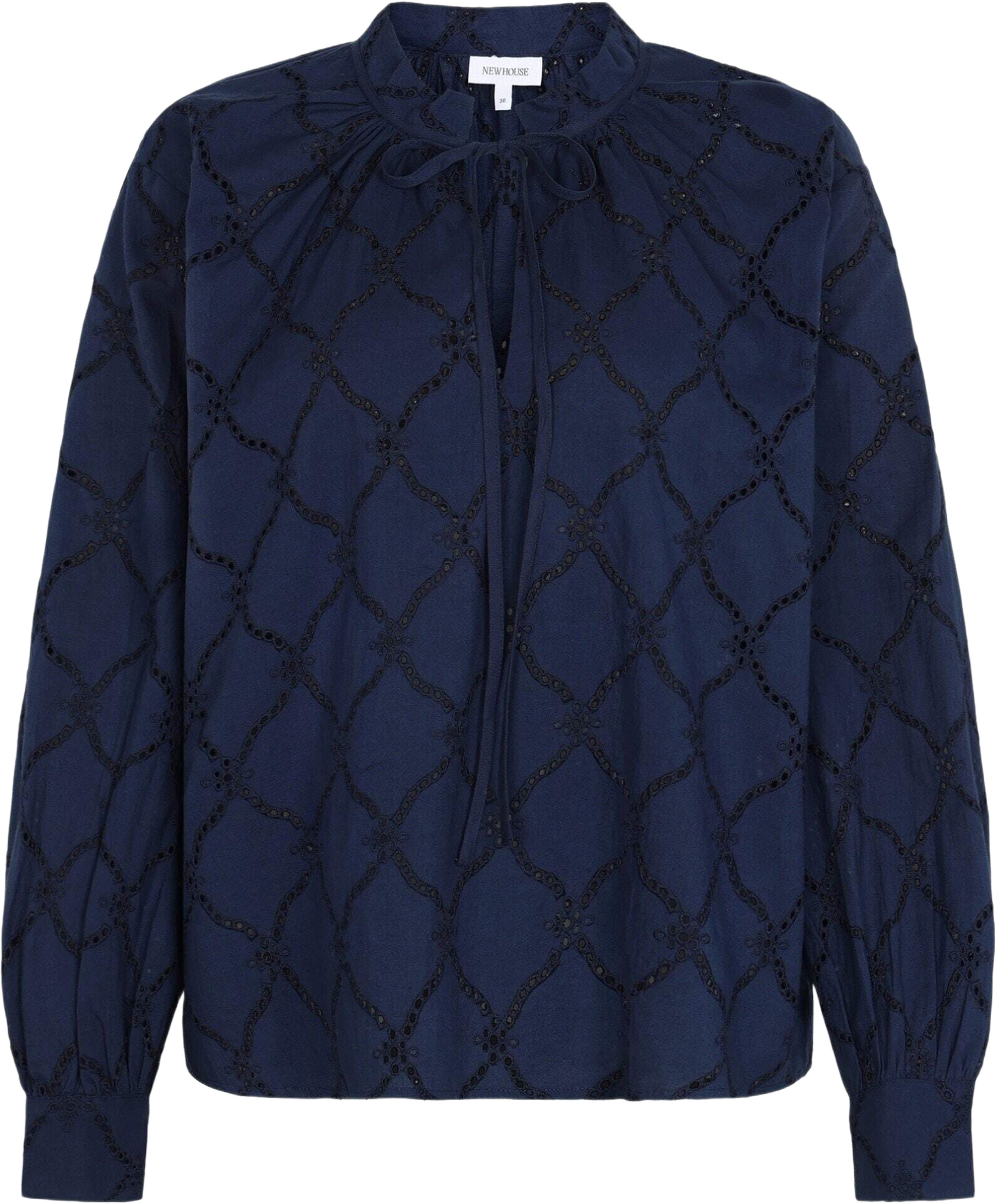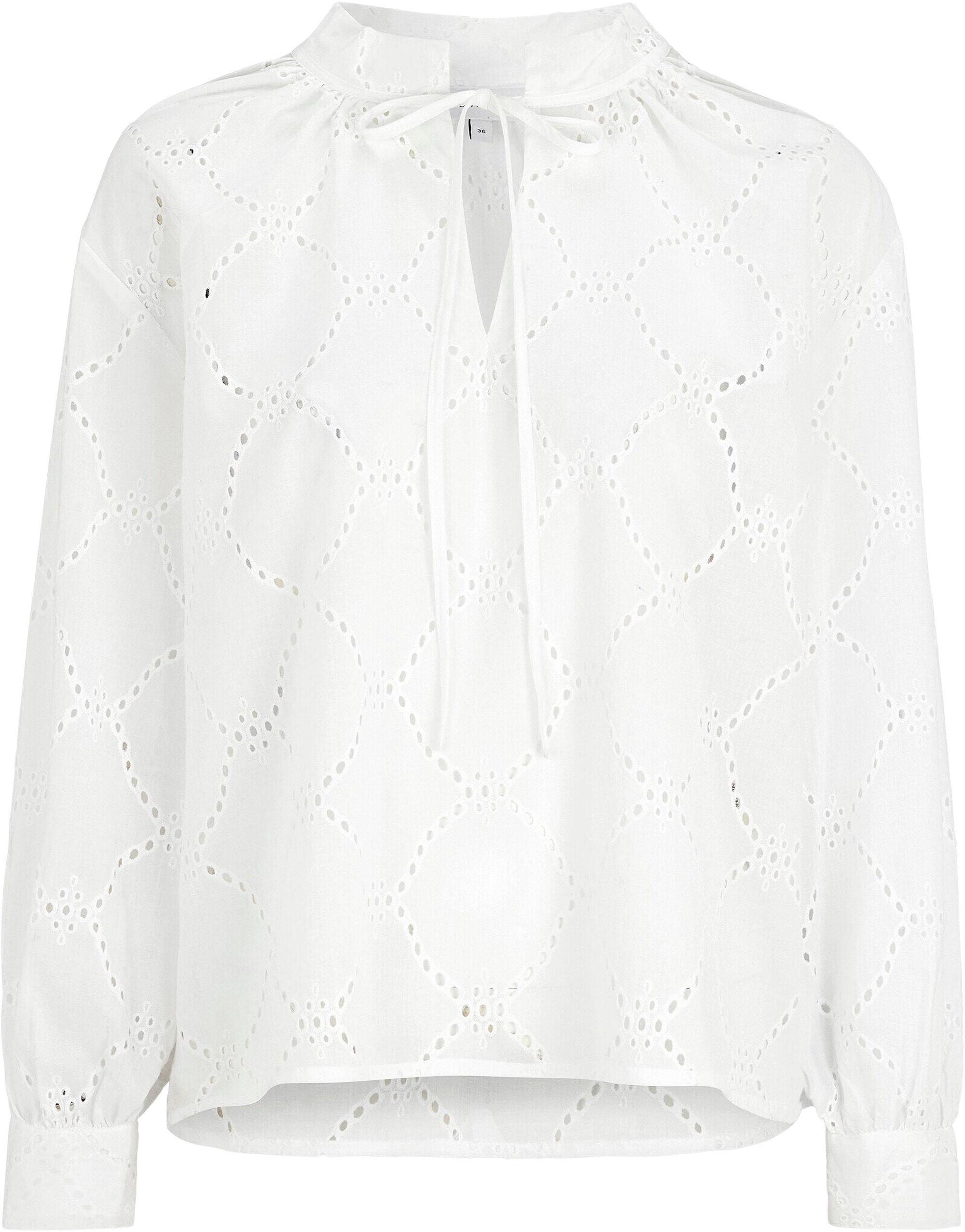 Blus i schifflietyg med dekorativt broderat mönster som ger ett luftigt och genomarbetat uttryck. Designad med krage och rynkdetaljer kring halsringningen. Lång ärm med manschett som skapar en balanserad silhuett.