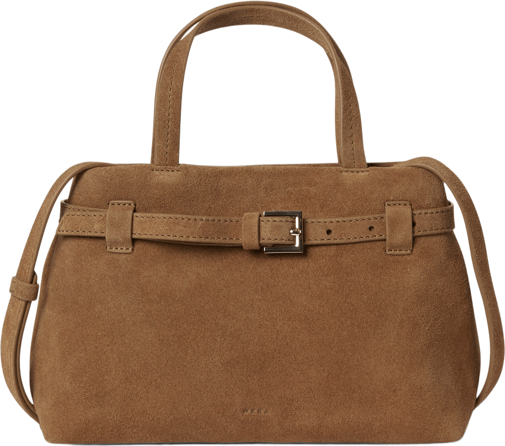 Liten mockaväska med dubbla topphandtag och avtagbar och justerbar axelrem som gör att väskan kan bäras i handen eller som crossbody.