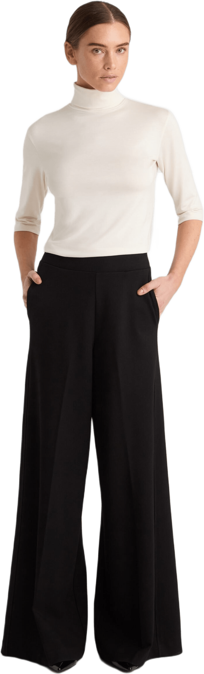 Luna är ett par långa, skräddade byxor med en extra vid passform som ger en feminin men kraftfull silhuett. Den eleganta designen kompletteras av pressveck framtill och snedställda sidofickor.