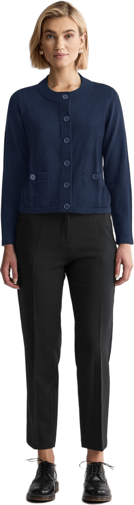 Rundhalsad cardigan i mulesingfri merinoull med snygga detaljer. Koftan har två dekorativa framfickor och knäpps med tonala knappar.