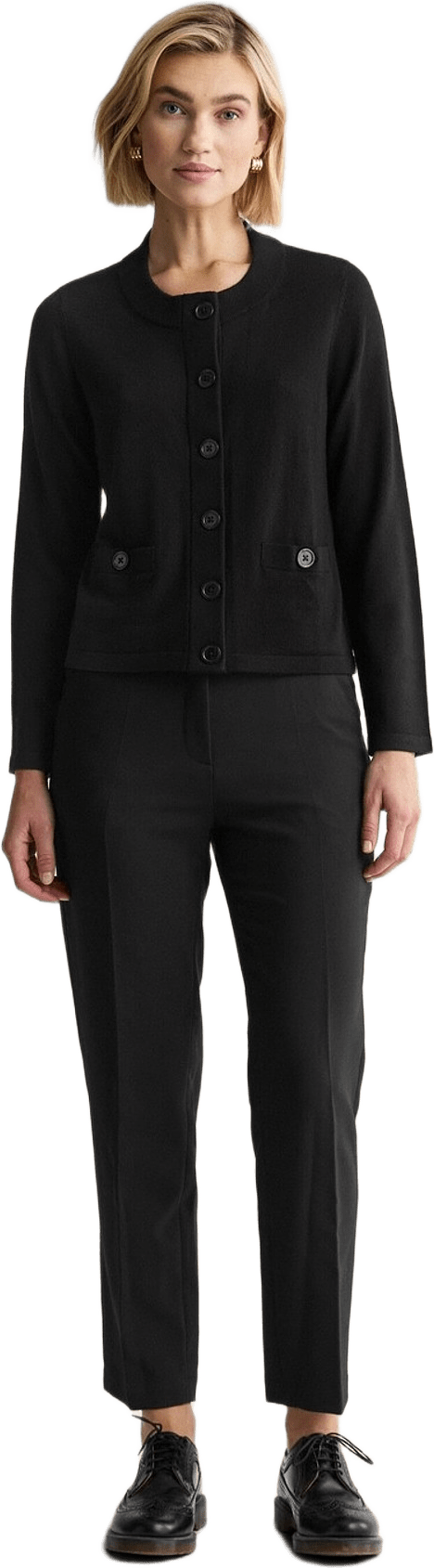 Rundhalsad cardigan i mulesingfri merinoull med snygga detaljer. Koftan har två dekorativa framfickor och knäpps med tonala knappar.