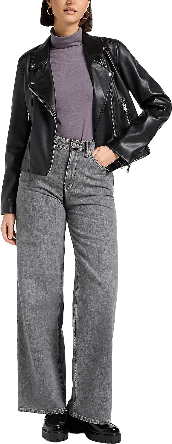 A sleek moto jacket can toughen up any outfit, and is an essential piece in everyone’s outerwear wardrobe. Our women’s Moto Jacket was designed with a classic, boxy relaxed fit that sits just below the waist. Adorned with silver hardware and an asymmetric front zip, it doesn’t get much more classic than this style. We also added two side pockets with metal zips in the same style. Throw on over dresses for an edgier look, or pair with our Moto Skirt for an on-theme look. This garment is crafted from a heavy 12.25oz material made from 100% PU, with minimal stretch. Finished in Black, for true versatility and simplicity. Finished with a silver hardware zip down the front, on the pockets and matching silver rivets.