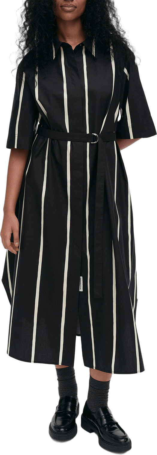 The Paperi shirt dress is made of organic cotton poplin, and it has a relaxed, A-line fit. The dress is printed in the Puhveli pattern. It has a pointed collar, a concealed button closure, side seam pockets, and short sleeves. The dress has a curved hem, and it comes with a separate D-ring belt.