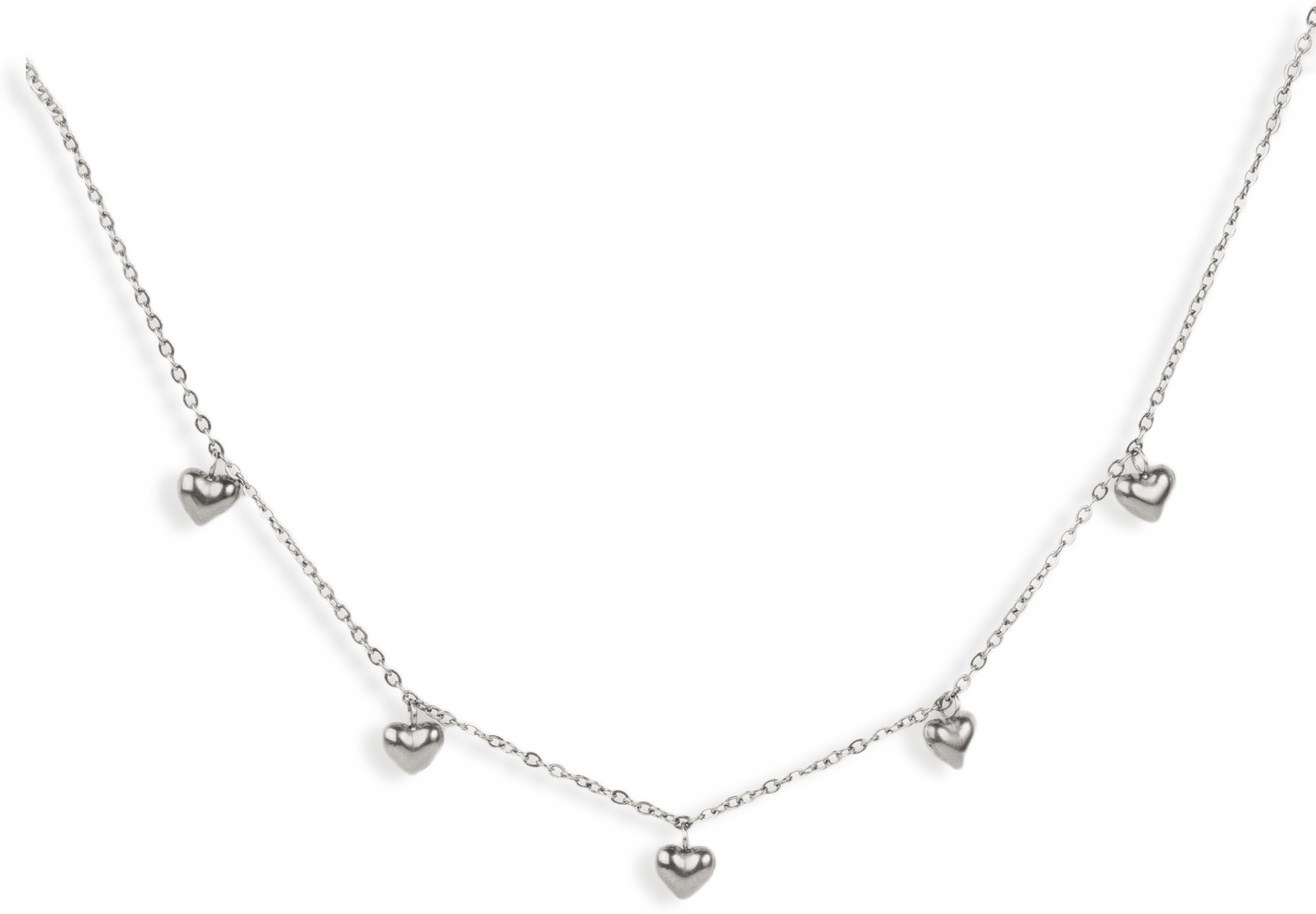 Ett supergulligt halsband som är gjort i rostfritt stål och finns i silver- och guldplätering. Halsbandet är 36 cm långt och har en extrakedja som är 6 cm (så total längd är 42 cm). Det är 5 små hjärtan mitt fram och de är 6 mm breda och höga. Nickelsäkert.
