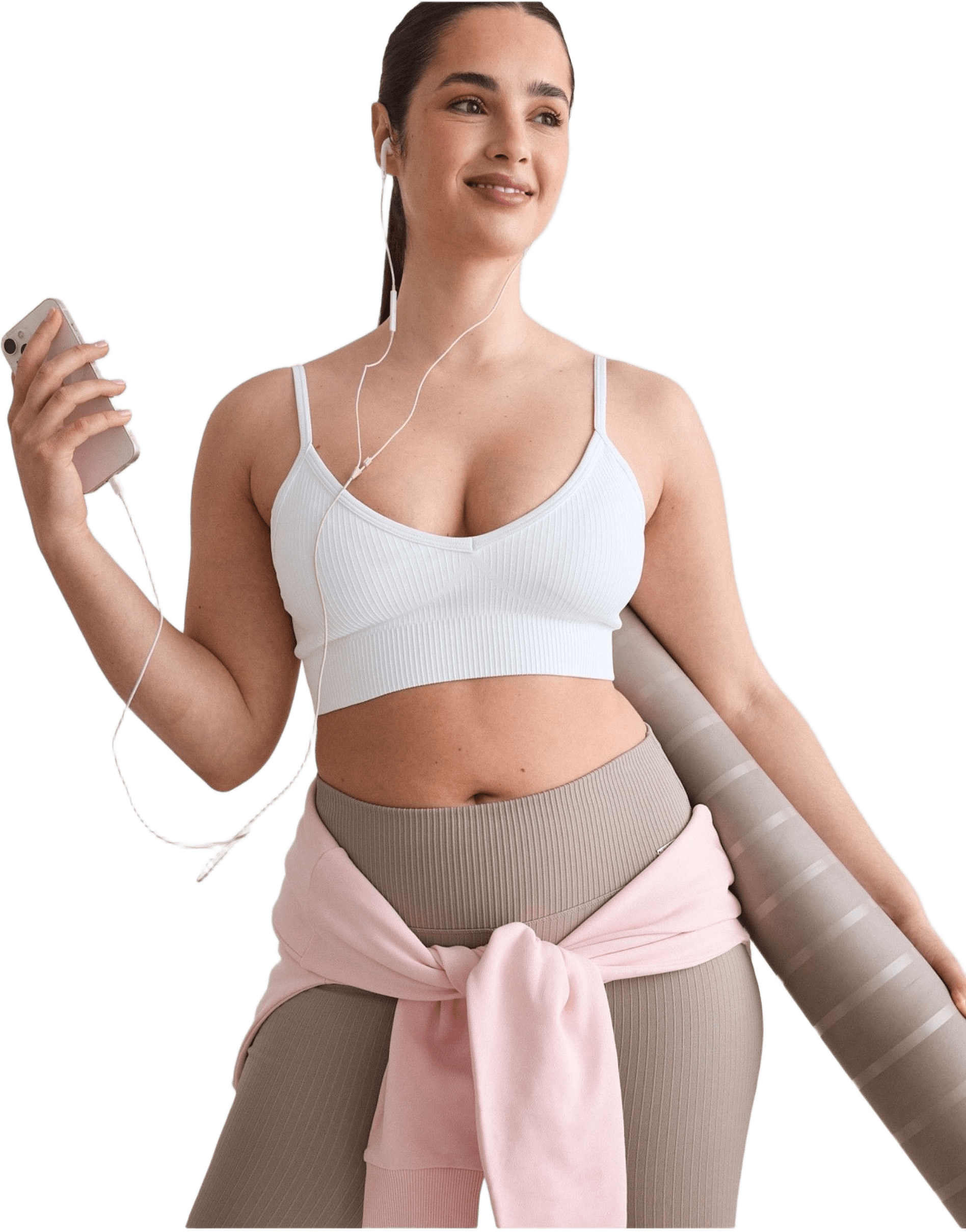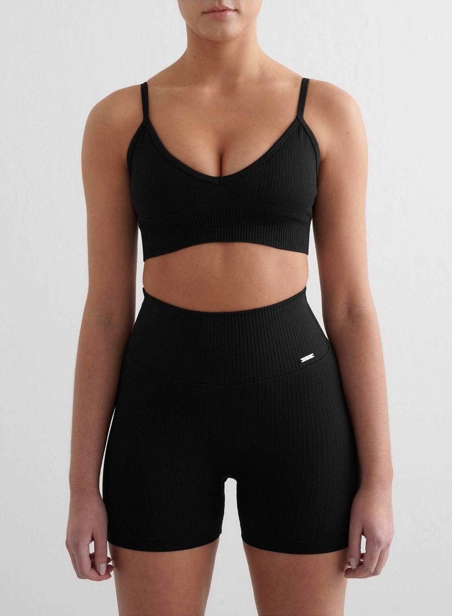 Ribbed Seamless Deep Cut Bra är gjord av vårt mjuka och stretchiga Ribbed Seamless-material. Den ribbade sport-bh:n är djupt skuren framtill. Sport bh:n har justerbara band, är fukttransporterande och har en metallbadge med aim’n logga baktill. Matcha den svarta sport bh med Ribbed Seamless-nederdelar för att skapa ett matchande set.