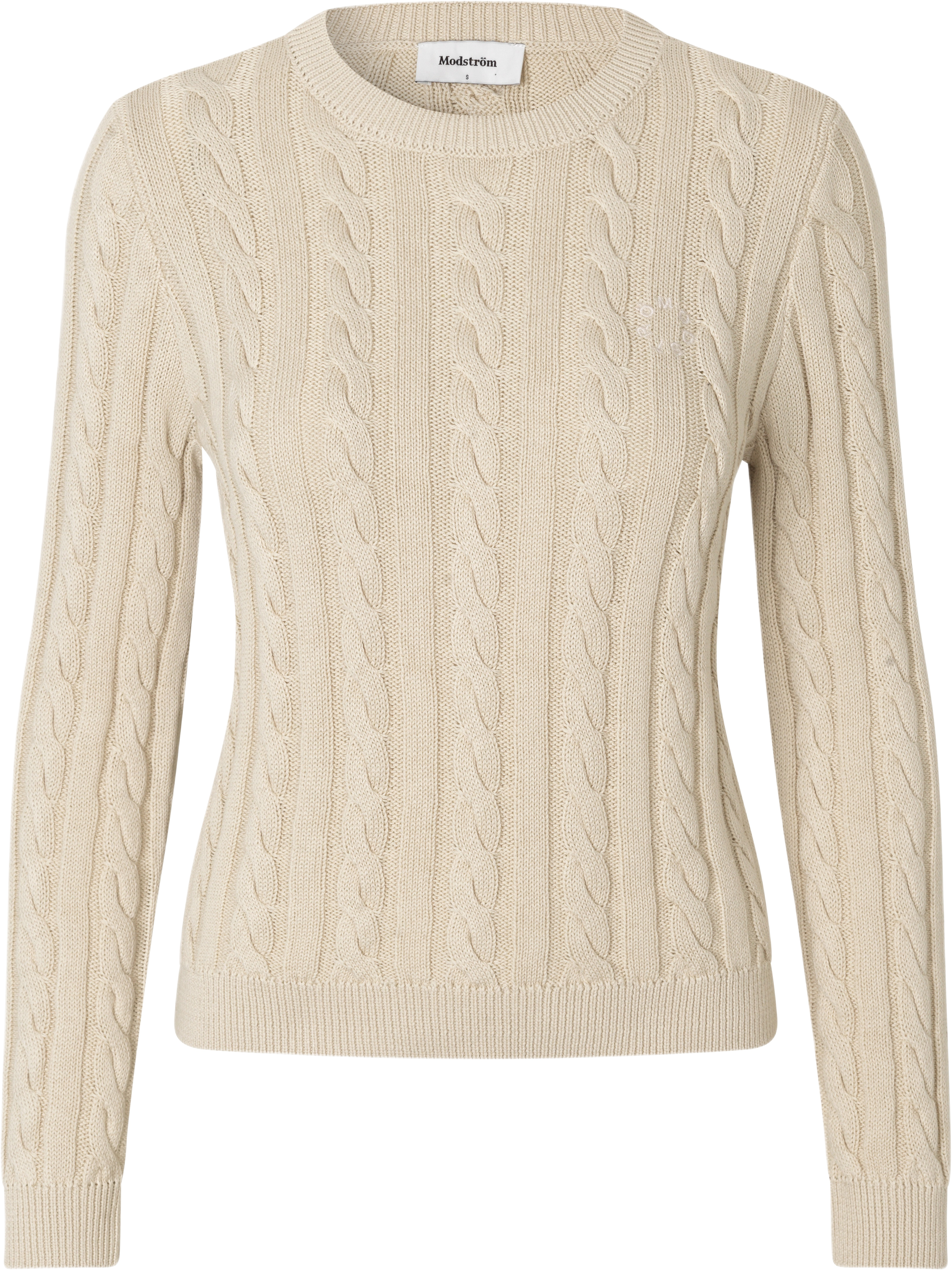 Sabremd O-neck är en figurnära stickad tröja med rund halsringning, tillverkad i 100 % ekologisk bomull. Tröjan har ett klassiskt flätstickat mönster och en broderad logotyp på bröstet. Modellen är 175 cm lång och bär storlek S/36