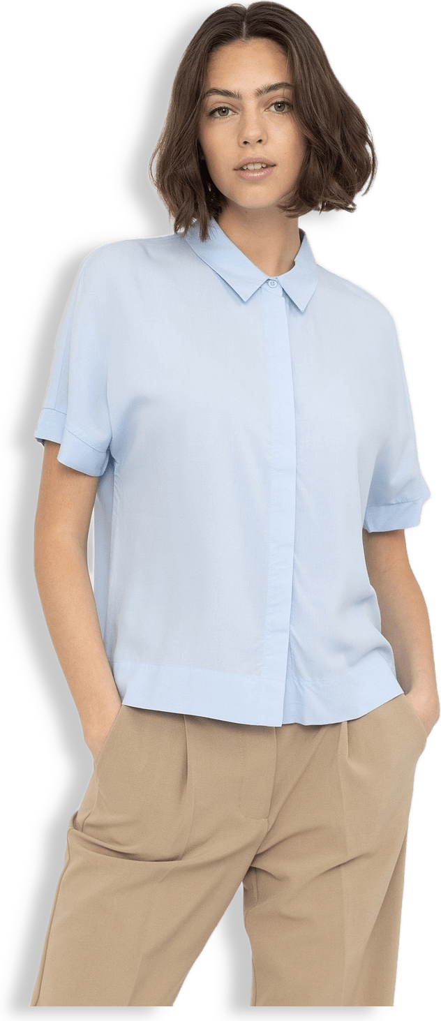 Tillverkad med korta ärmar, en klassisk skjortkrage, en dold knappstängning och breda axlar.