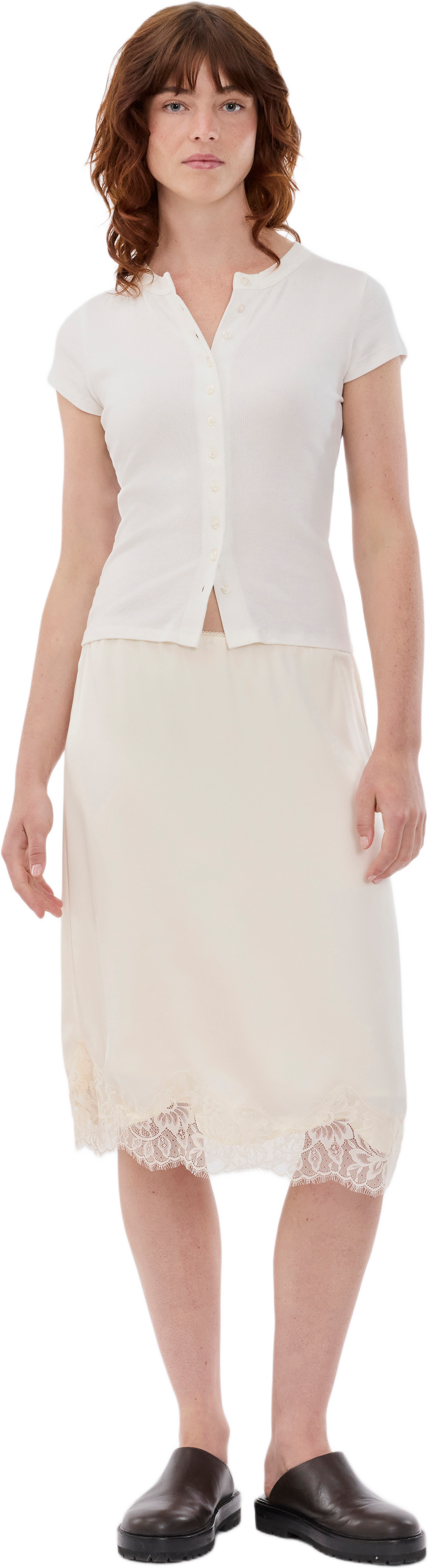 Ribbad T-shirt med knappar framtill. VilsonMD T-shirt har korta ärmar, figurnära silhuett och höftlång längd. En modern och feminin T-shirt som kombinerar klassiska detaljer med en tidlös, elegant stil.