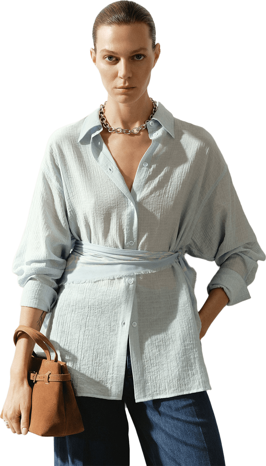 Blusen är generös i storleken, så tog en storlek mindre. Härligt svalt material (viscose/lite bomull) med fin struktur. Färgen är matt ljusblå.