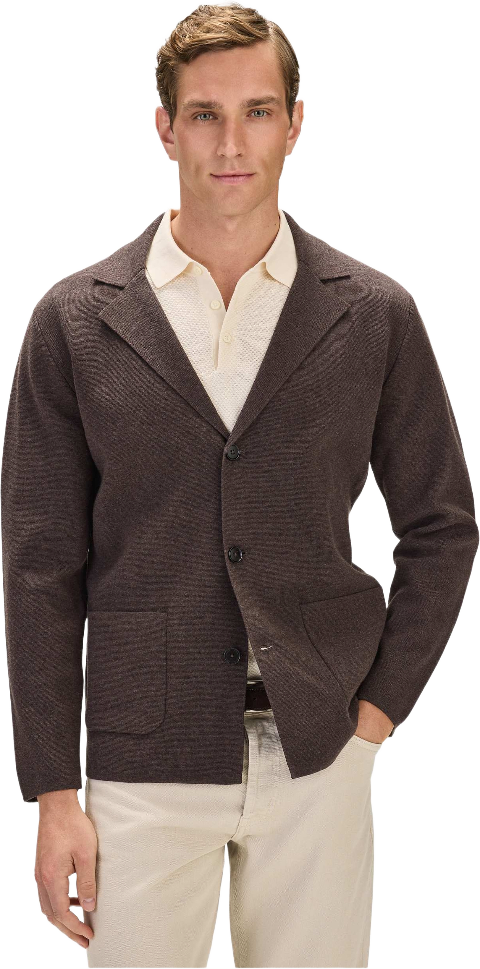 Höj din vardagseleganta garderob med denna mångsidiga stickade bomullsblazer som kombinerar komforten från stickade plagg med klassisk skräddarsydd stil.