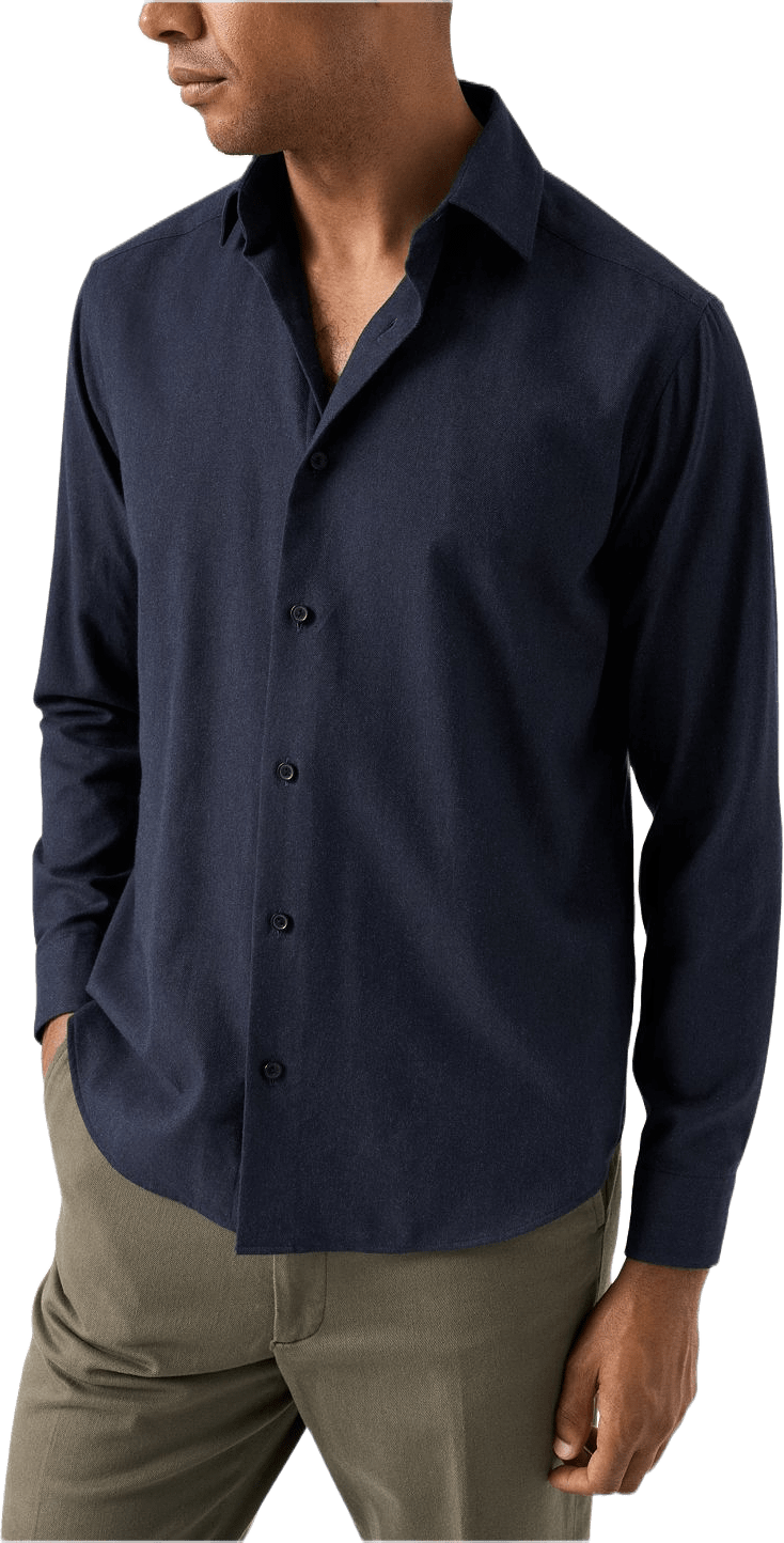 Den här vackra skjortan är sydd i ett härligt mjukt flanelltyg av 100 % bomull från den italienska vävaren Canclini. Vävd i en enfärgad design som framhäver den snygga twillstrukturen och passar perfekt med en stickad tröja eller en soft jacket. Den är sydd i dubbeltvinnat bomullsgarn och borstad för extra mjukhet. Skjortan är försedd med benfärgade knappar graverade med Eton 1928. Den nya passformen Casual Fit saknar insnitt baktill och den böjda fållen skapar en mångsidig skjorta som gör sig lika bra oinstoppad som instoppad.