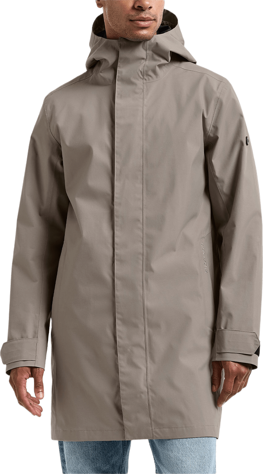 100% vattentät & tejpade sömmar, fasthuva, frontslå med knappar, tvåvägsdragkedja, två sidofickor med dragkedja, en innerficka med dragkedja