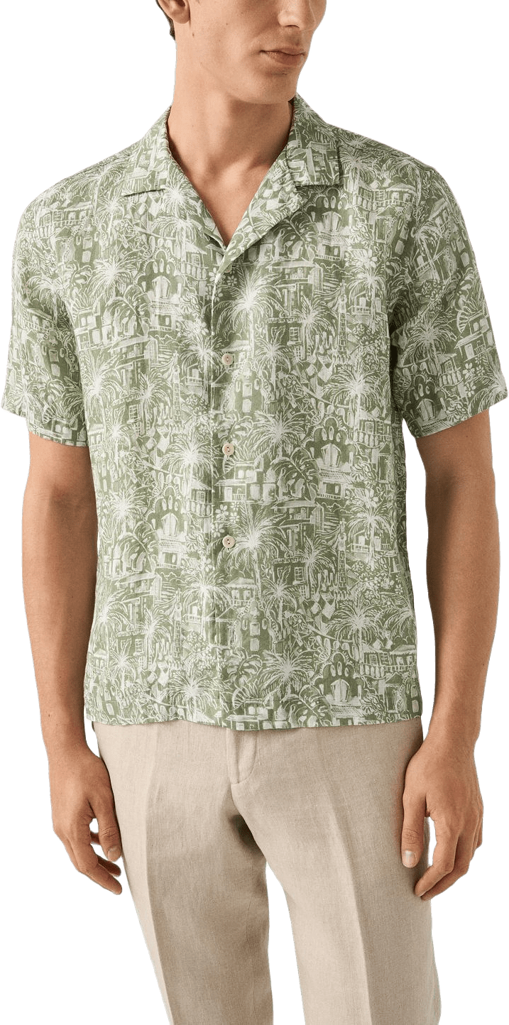 Denna eleganta skjorta är tillverkad av 100% linne och pryds av säsongens nyckelmönster, inspirerat av Gaudís Barcelona och handmålat av Etos egna in-house artist. Mönstret framhäver en vacker kombination av natur och arkitektur från Barcelona, och skjortan är plaggfärgad för en mer avslappnad stil.