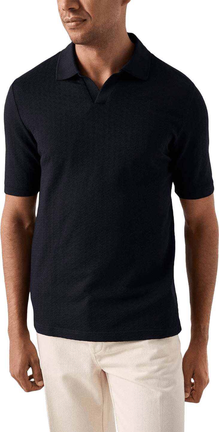 Den här nya designen har en öppen krage som ger ett avslappnat intryck. Plagget är stickat i ett fylligt och mjukt jacquardjerseytyg, tillverkat av 100% Supima-bomull, vilket garanterar ett mjukt och behagligt tyg av högsta kvalitet. Den vackra jacquardstrukturen förhöjer det eleganta utseendet.