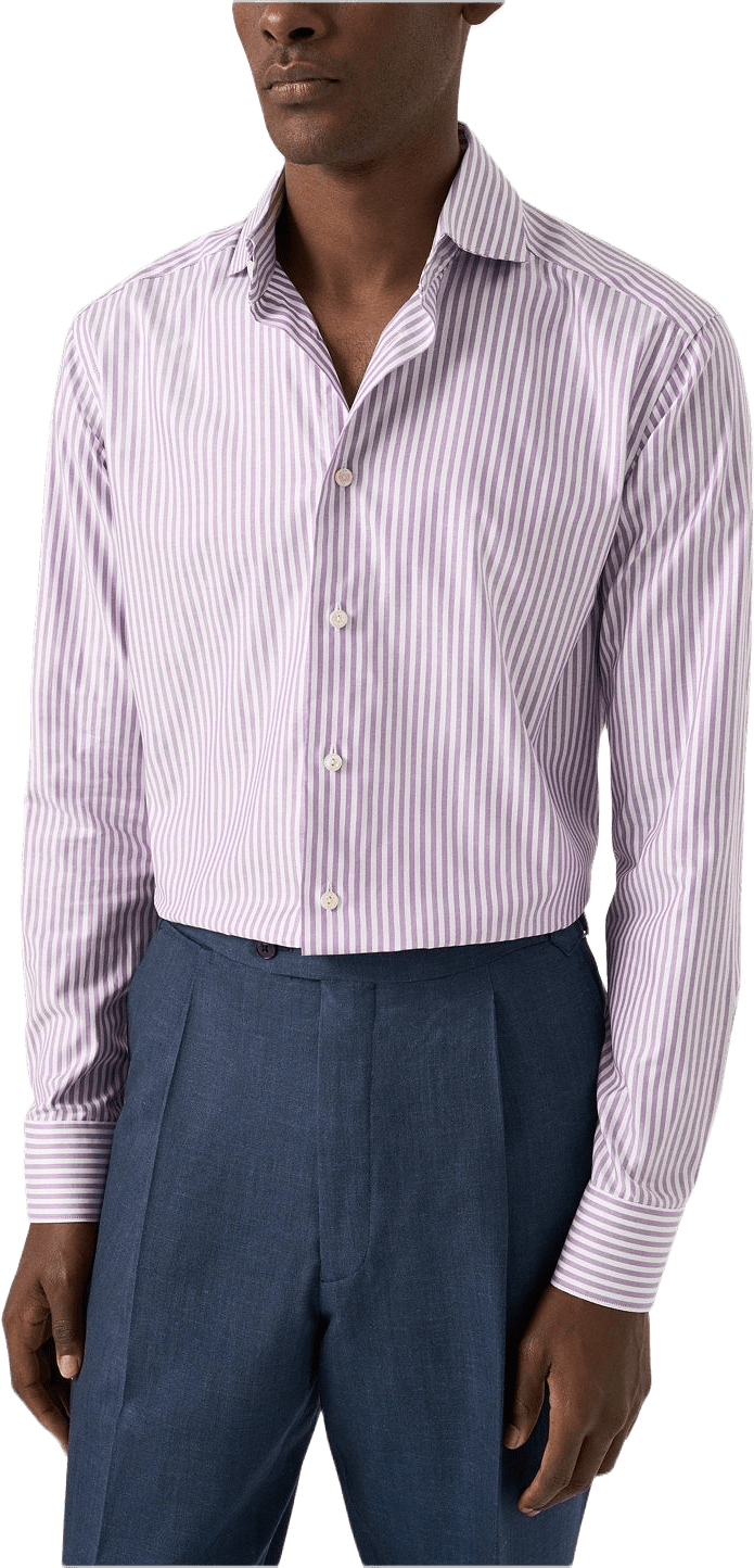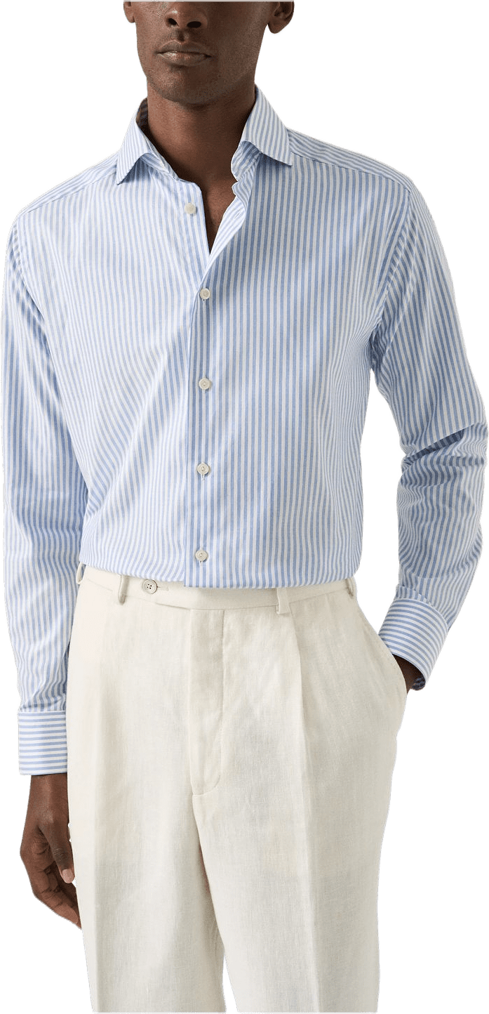 En klassisk skjorta i Etons signatur-Oxfordtyg, vävd i 100 % ekologisk bomull för en mjuk, skrynkeltålig yta och en lätt, luftig känsla. Tyget har en fin korgväv som fungerar året runt. Det är vävt i ett tidlöst bengalrandigt mönster och kompletteras av vita standardknappar, vilket ger ett välklätt och mångsidigt uttryck som passar i många sammanhang.