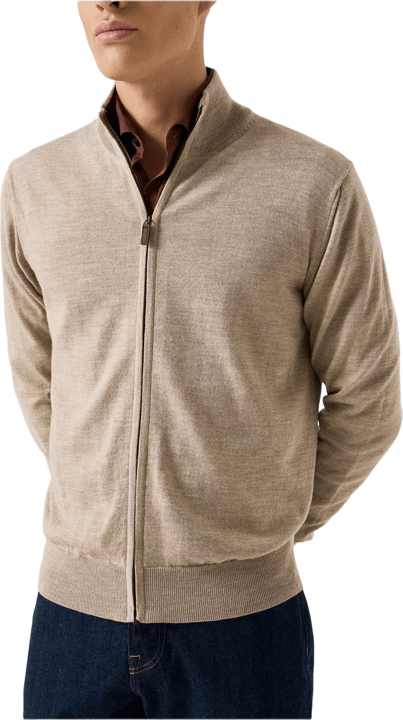 Elegant kofta med genomgående dragkedja, tillverkad i Italien av Maglificio Venezia – mästare på lyxstickat. Stickad i extrafin merinoull med 12-gauge-stickning – en perfekt vikt för året runt. Modellen har en praktisk tvåvägsdragkedja och kröns av en läderklädd dragare. Tidlös ribbstickning vid krage och muddar ger struktur och en förfinad känsla. Den diskreta kontrastfärgen på kragens insida ger en elegant accent.